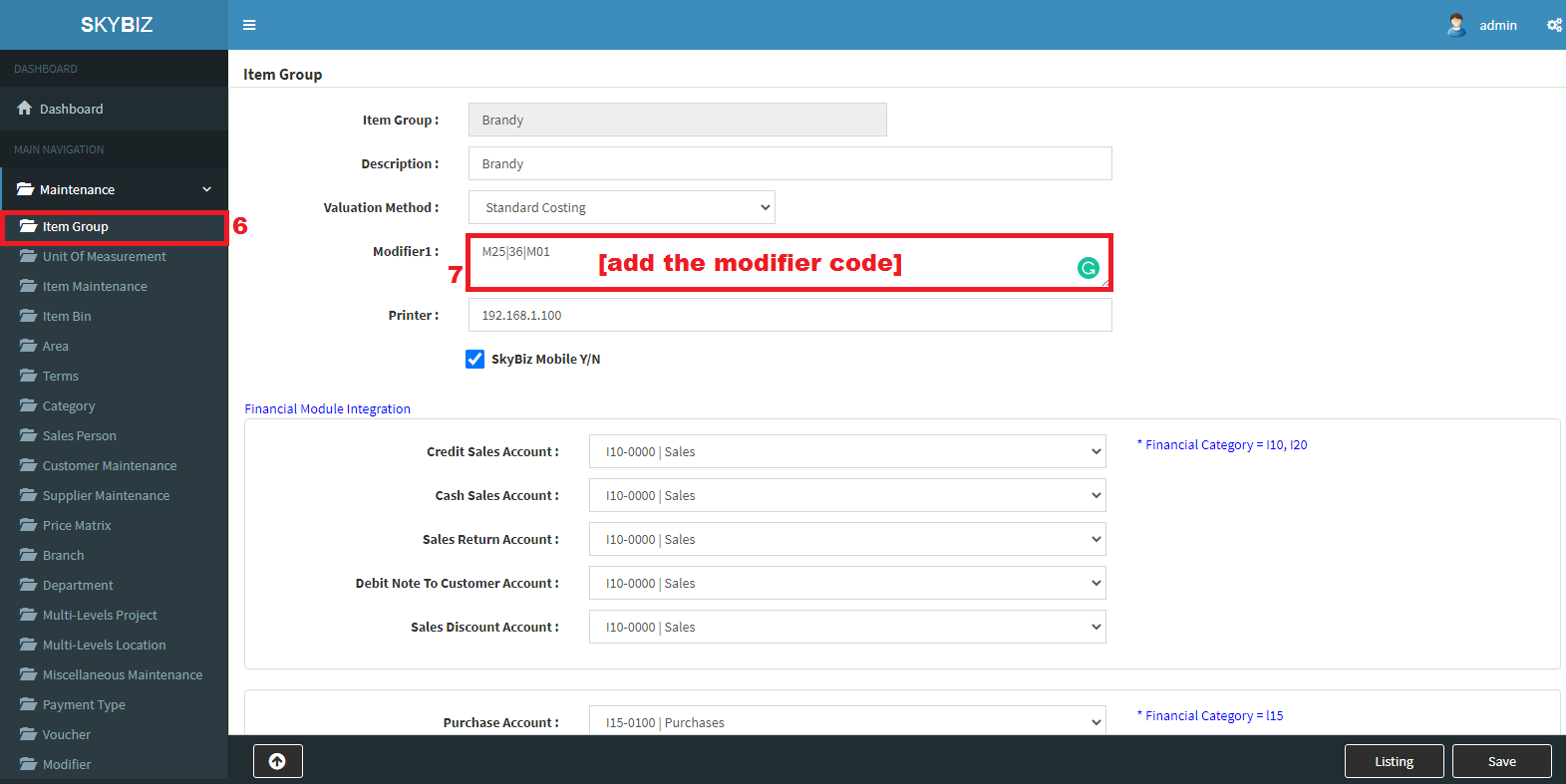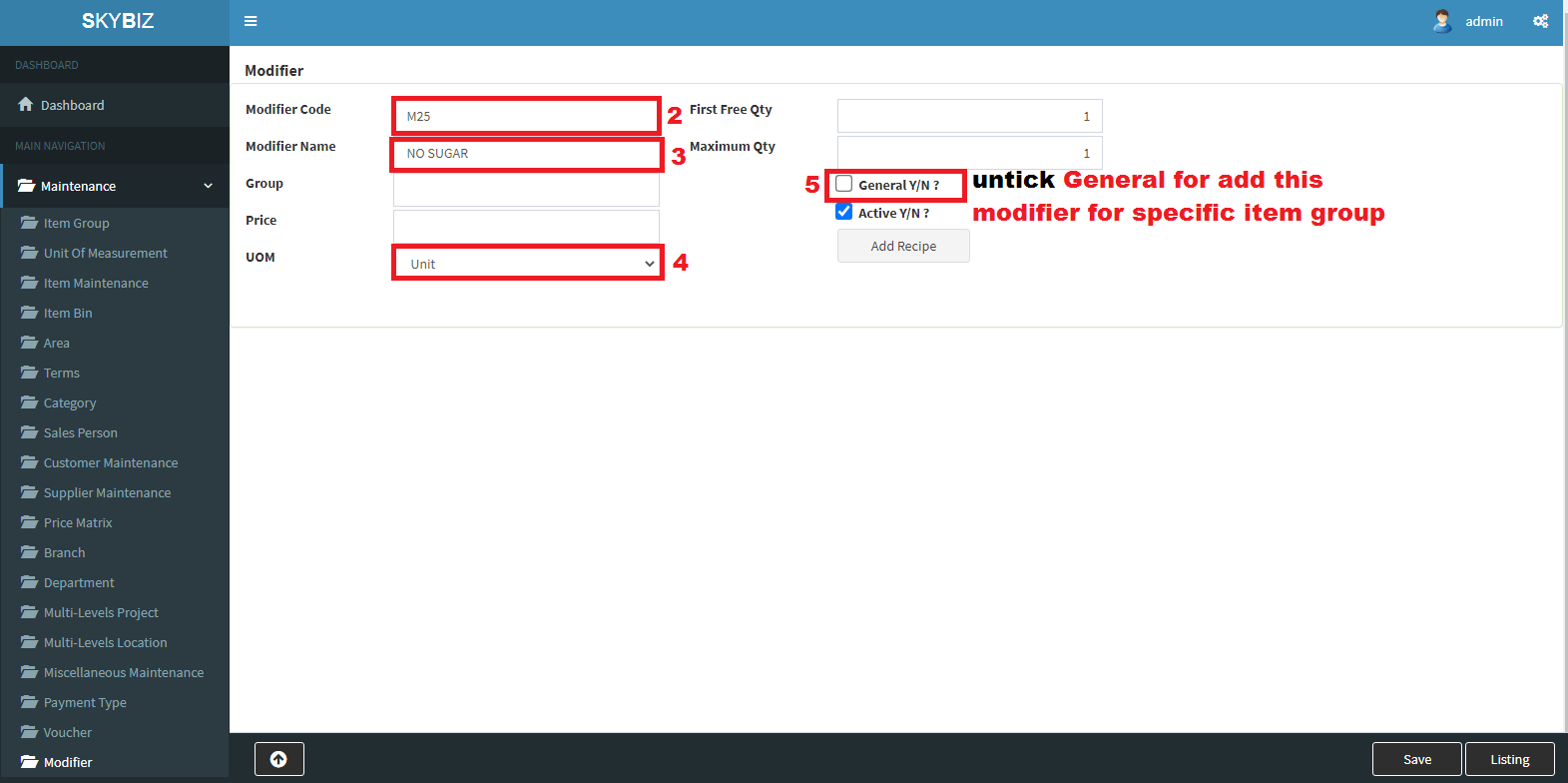 1. Go to Maintenance>>Modifier