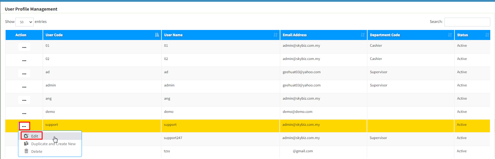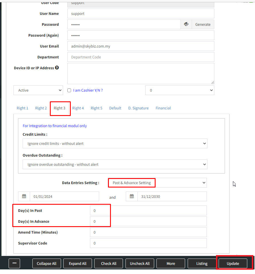 Block user entry for past and future transactions. 2025-11-19 0803. Security Manager 1.Go to : ” Setting “ >> ” Security Manager “ >> ” User Profile Management “ 2.Go to : ” Listing “ 3. Find the User >> click ” Edit “ 4. Right 3 >>> Data Entries Setting choose Past & Advance setting >>> fill Day(s) In Past & Advance >>> update