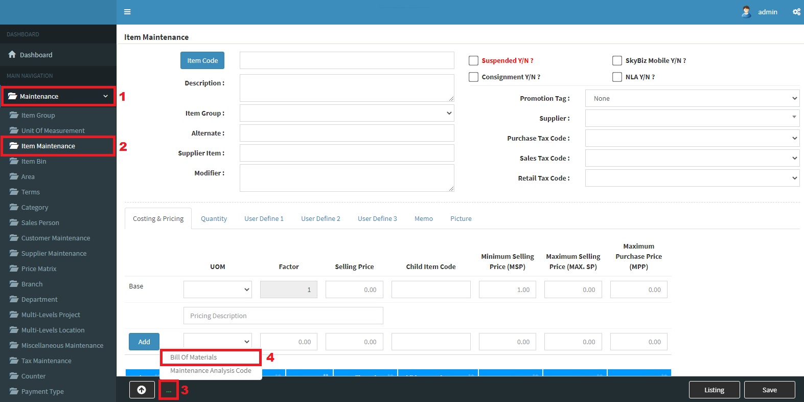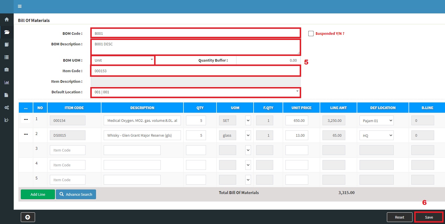 3. Fill up BOM Code, BOM Description, BOM UOM, Item Code
