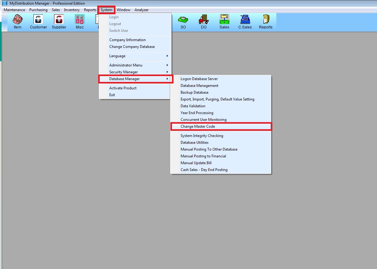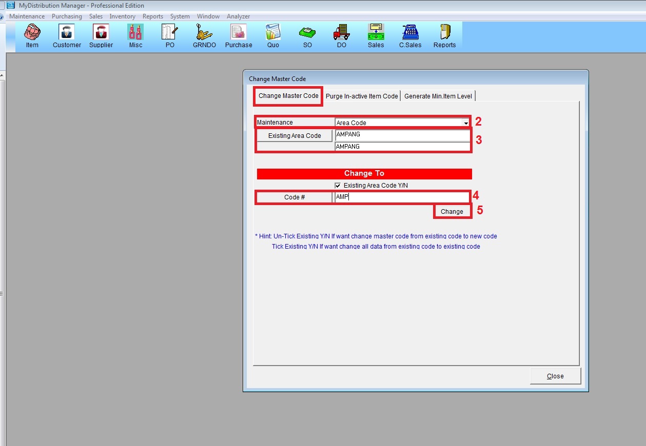 - 4. key in new Area code (tick “existing Area Code Y/N” {optional} if want all transactions/setting to follow the new Area Code)