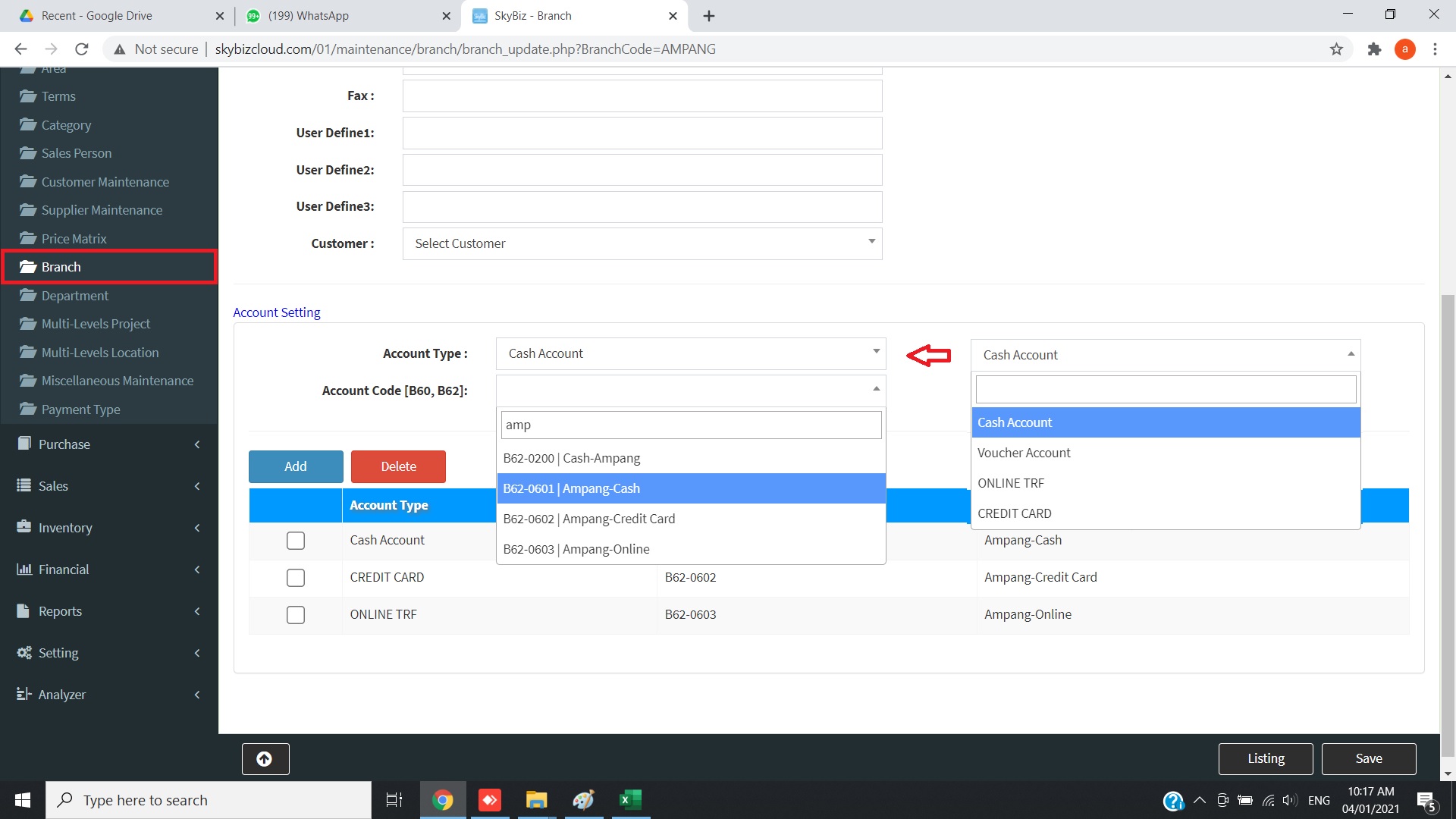 - In the account setting part, Select Account Type [Cash Account] and fill up account code and click Add to save the setting