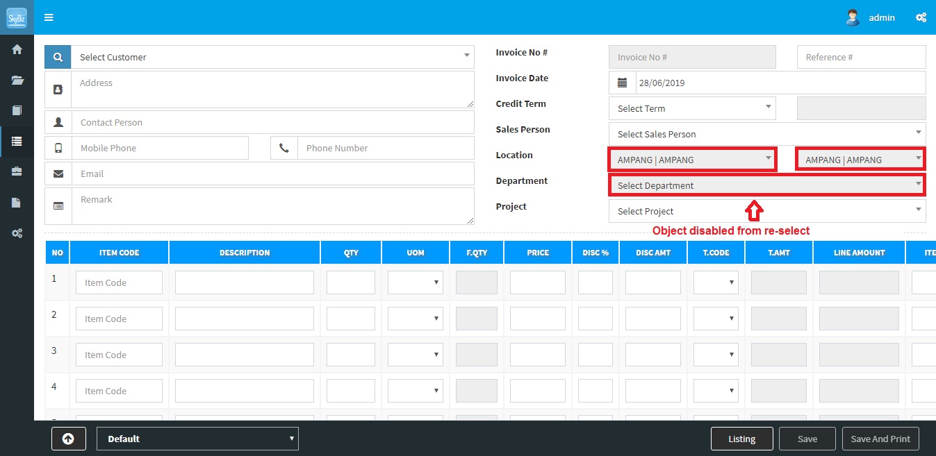 Sales Invoice – disallow re-select preset profile setting – disable Location, Branch, Department, Project, etc 2019-06-28 0803. Security Manager, SkyBiz Cloud Below are guideline(s) to disallow re-select preset profile setting: Go to Setting>>Security Manager>>User Profile Management. Follow screen shot below. User Profile Management Sales Invoice after disable object Powered By : SKYBIZ ® Beyond Cloud ™
