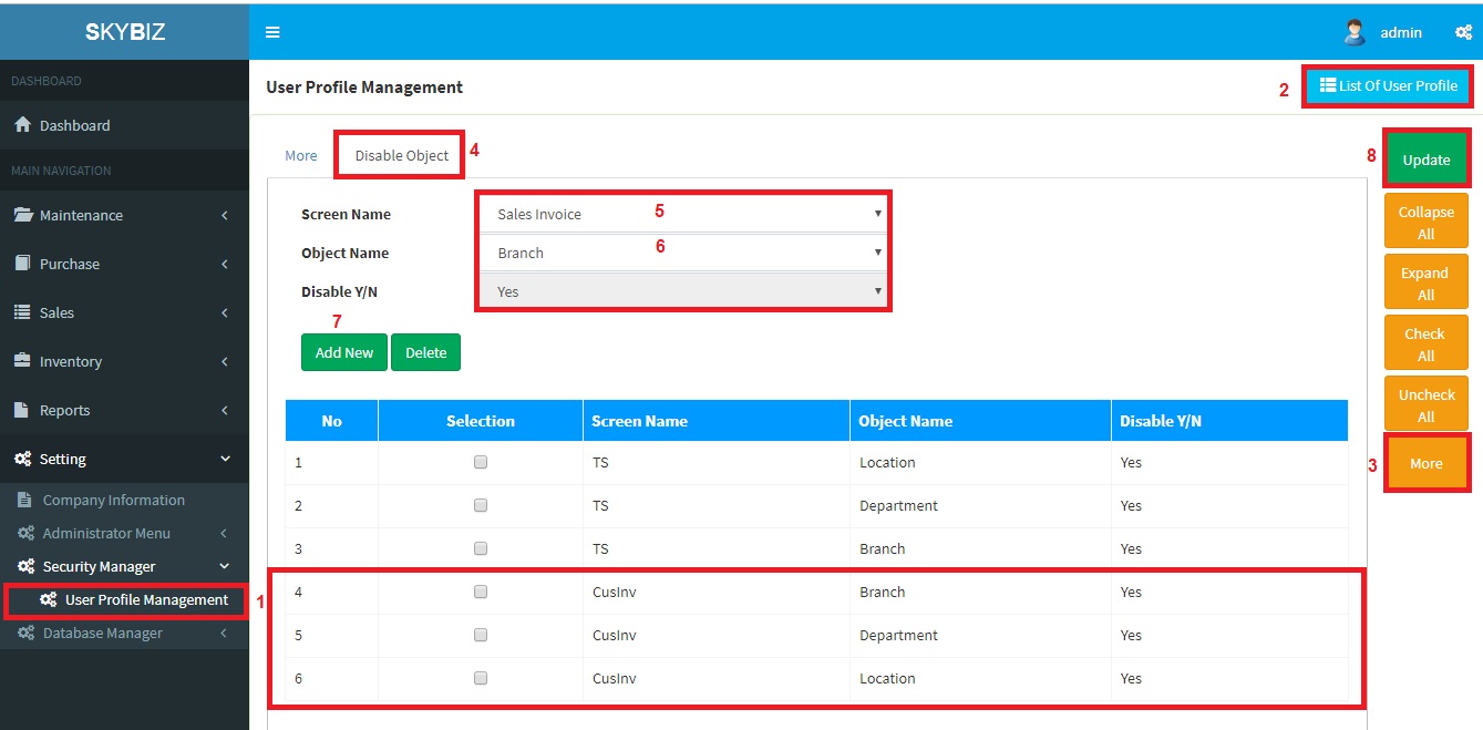 2019-06-28 0803. Security Manager, SkyBiz Cloud Below are guideline(s) to disallow re-select preset profile setting: Go to Setting>>Security Manager>>User Profile Management. Follow screen shot below. User Profile Management Sales Invoice after disable object Powered By : SKYBIZ ® Beyond Cloud ™