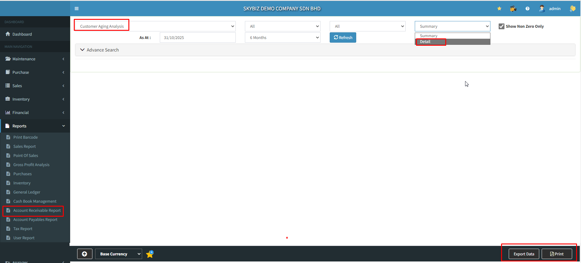 2. Click Reports>>Account Receivable>>Customer Aging Analysis