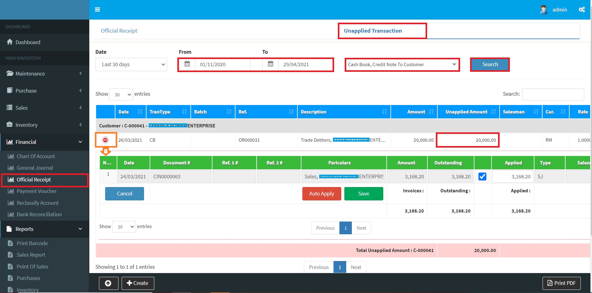 - Click menu Financial>>Official Receipt>>Listing>>Unapplied Transaction.