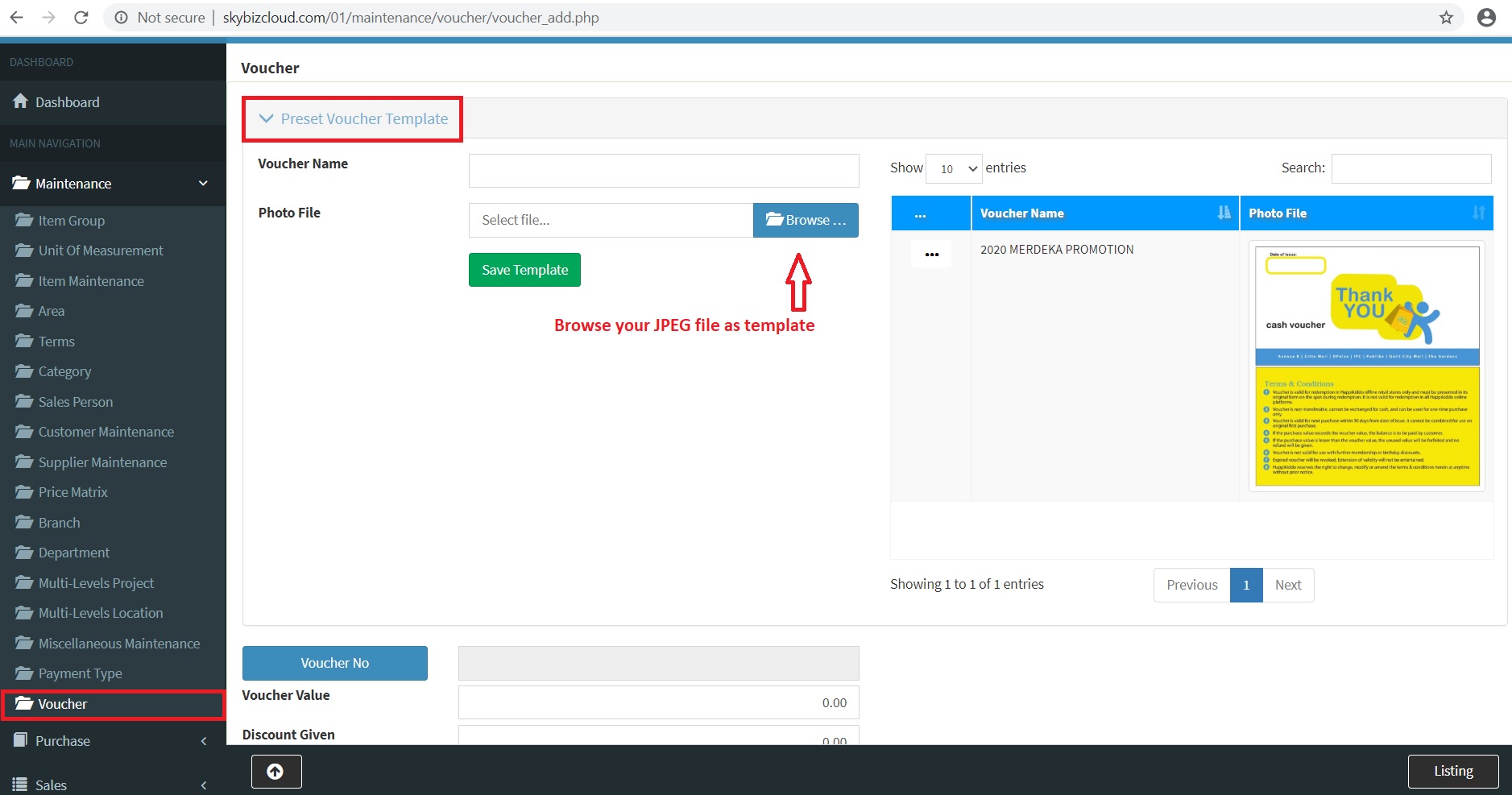 - Please fill up Voucher Name, Photo File (Browse and attach JPEG as template).