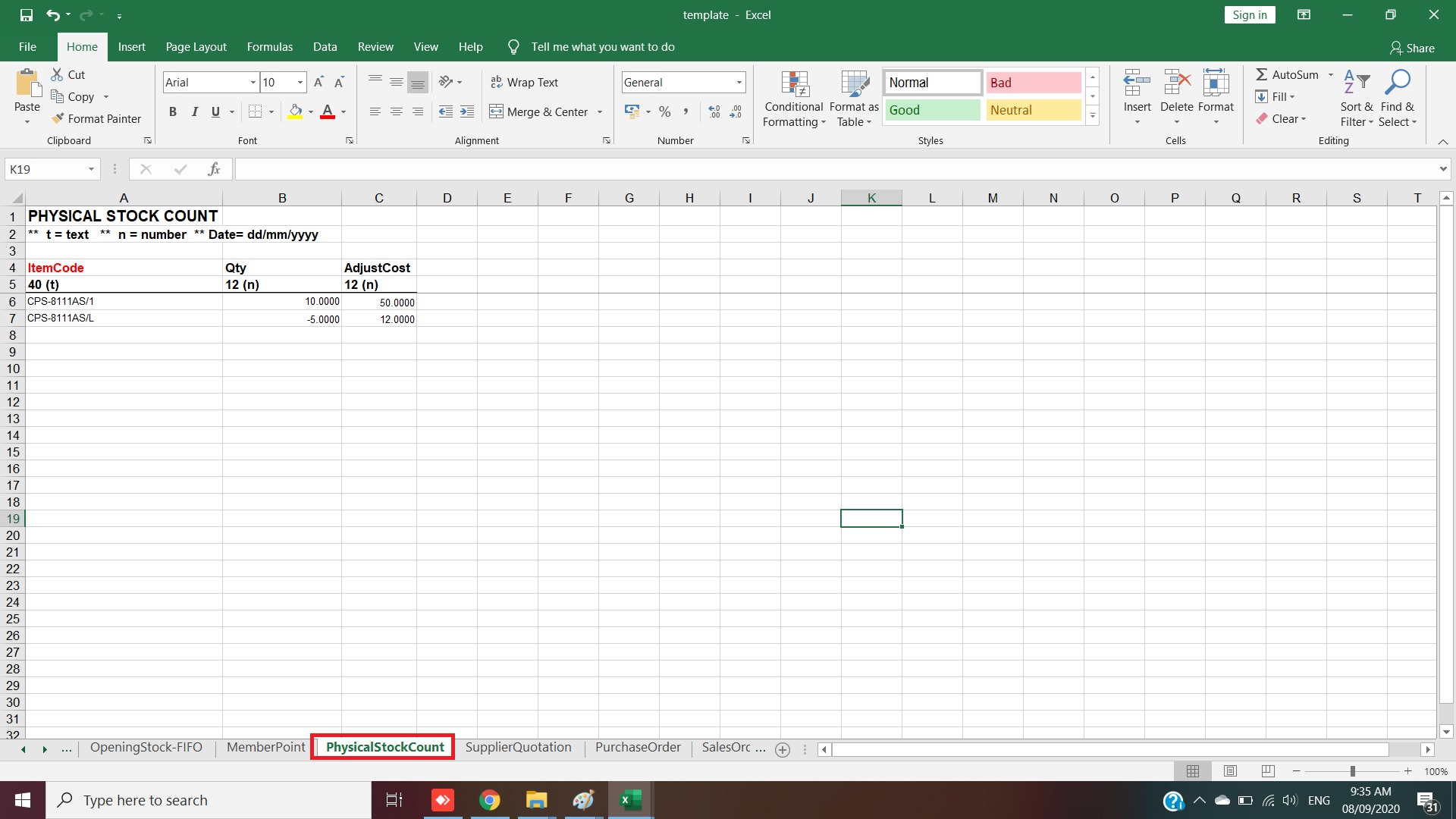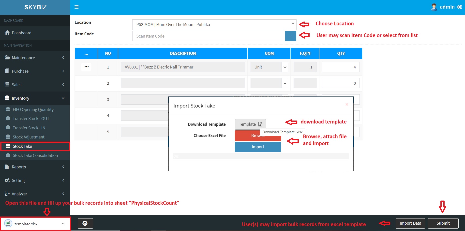 - Click Import Data, download template. Arrange your data into sheet “PhysicalStockCount“