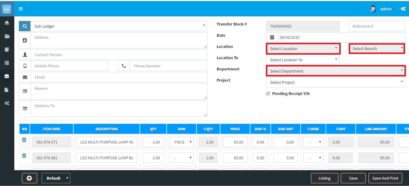 Transfer Stock – disallow re-select preset profile setting – disable Location, Branch, Department, Project 2019-06-28 SkyBiz Cloud Below are guideline(s) to disallow re-select preset profile setting: Go to Setting>>Security Manager>>User Profile Management. Follow screen shot below. User Profile Management Transfer Stock after disable object Powered By : SKYBIZ ® Beyond Cloud ™