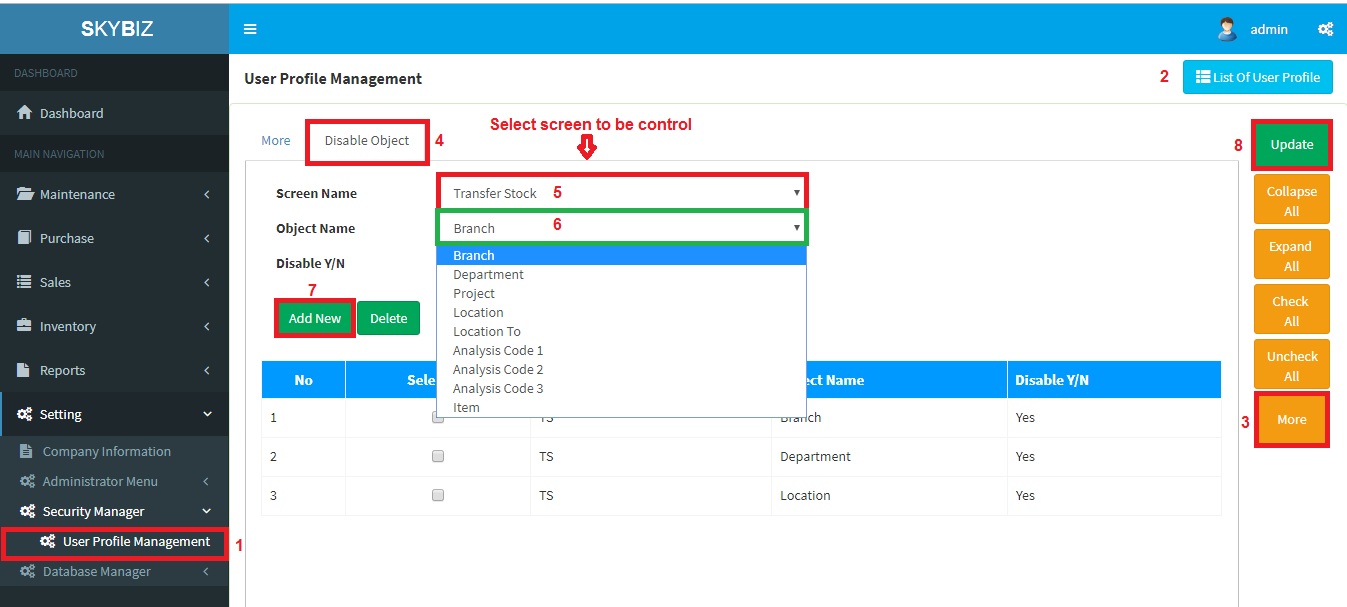 2019-06-28 SkyBiz Cloud Below are guideline(s) to disallow re-select preset profile setting: Go to Setting>>Security Manager>>User Profile Management. Follow screen shot below. User Profile Management Transfer Stock after disable object Powered By : SKYBIZ ® Beyond Cloud ™