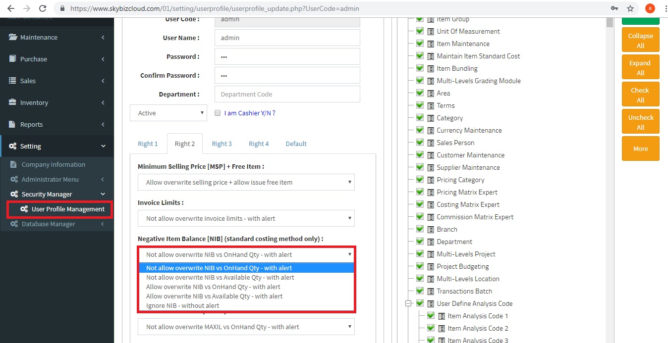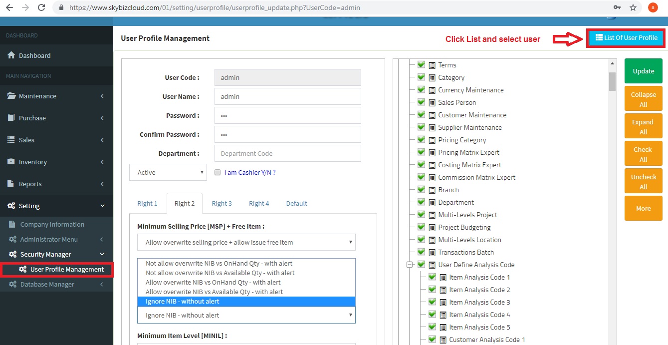 - Click “Security Manager>>User Profile Management>>Right 2>>.