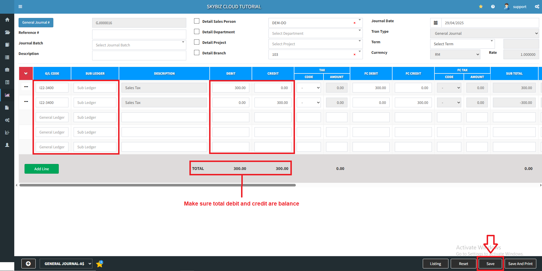 3. After that, fill in your debit and credit amount. Make sure your total debit and credit are balanced.