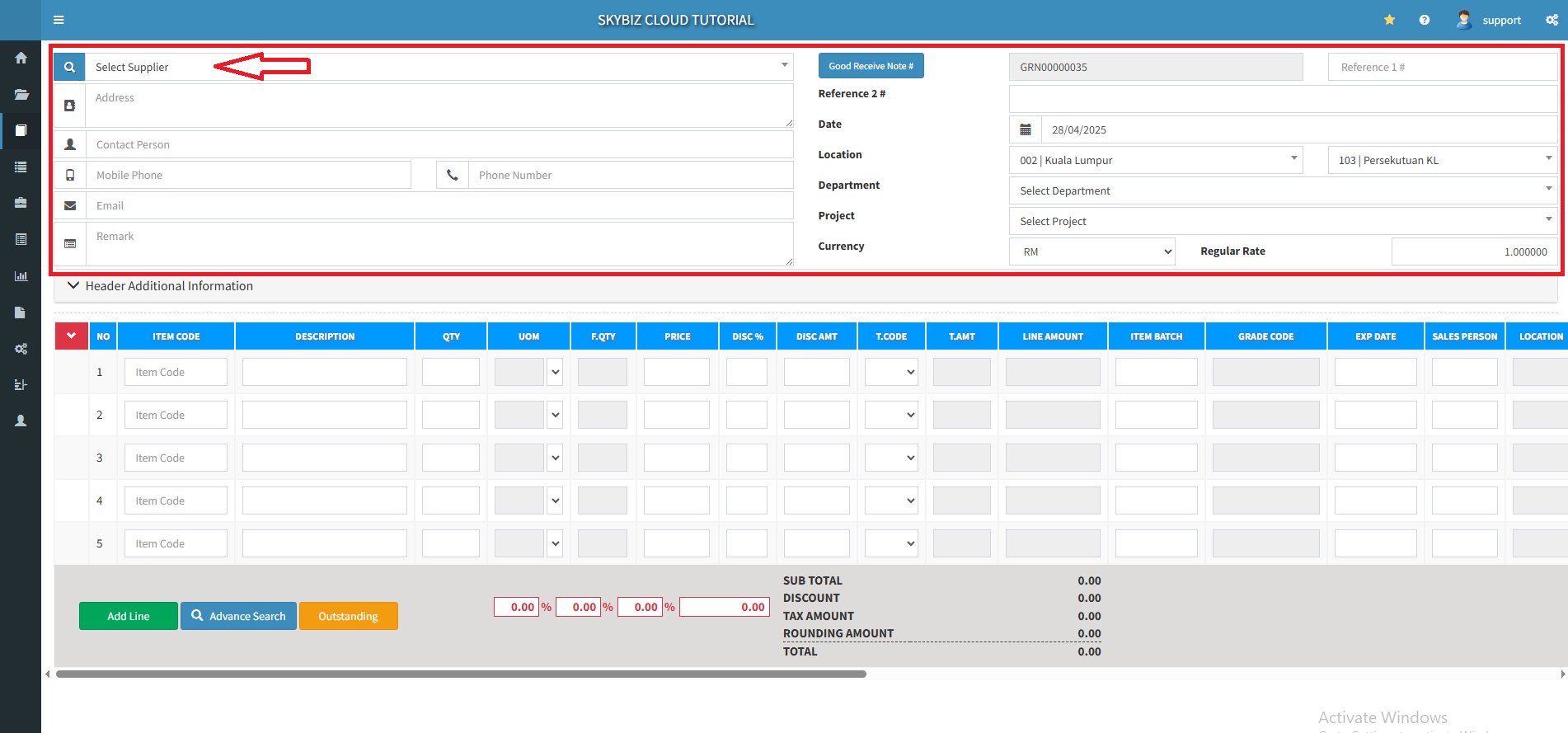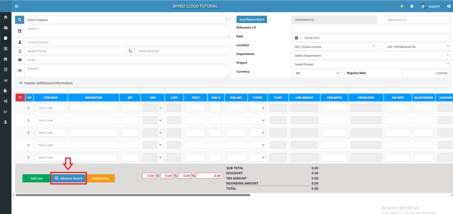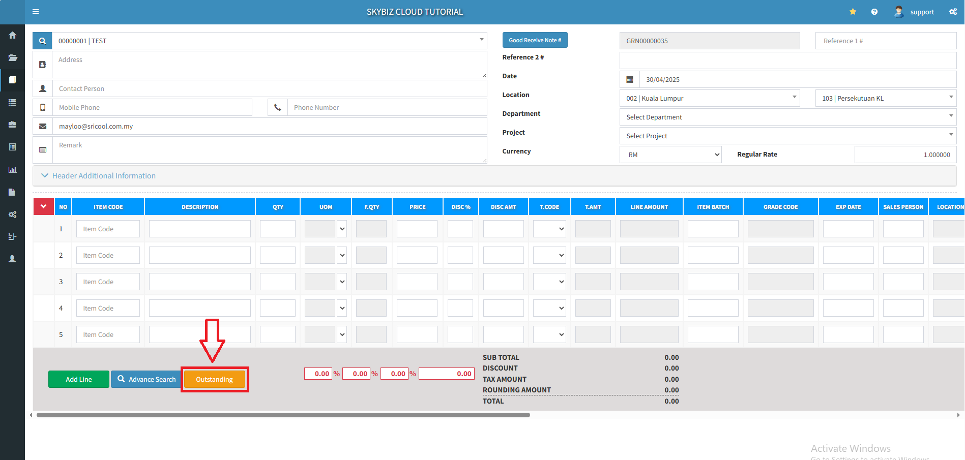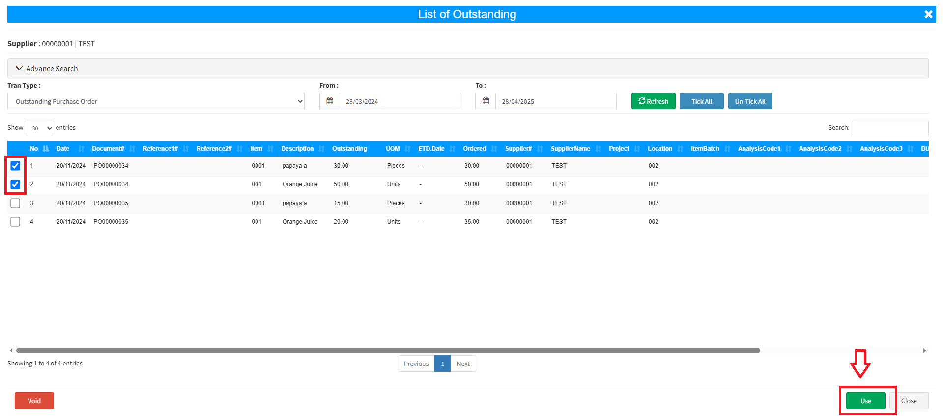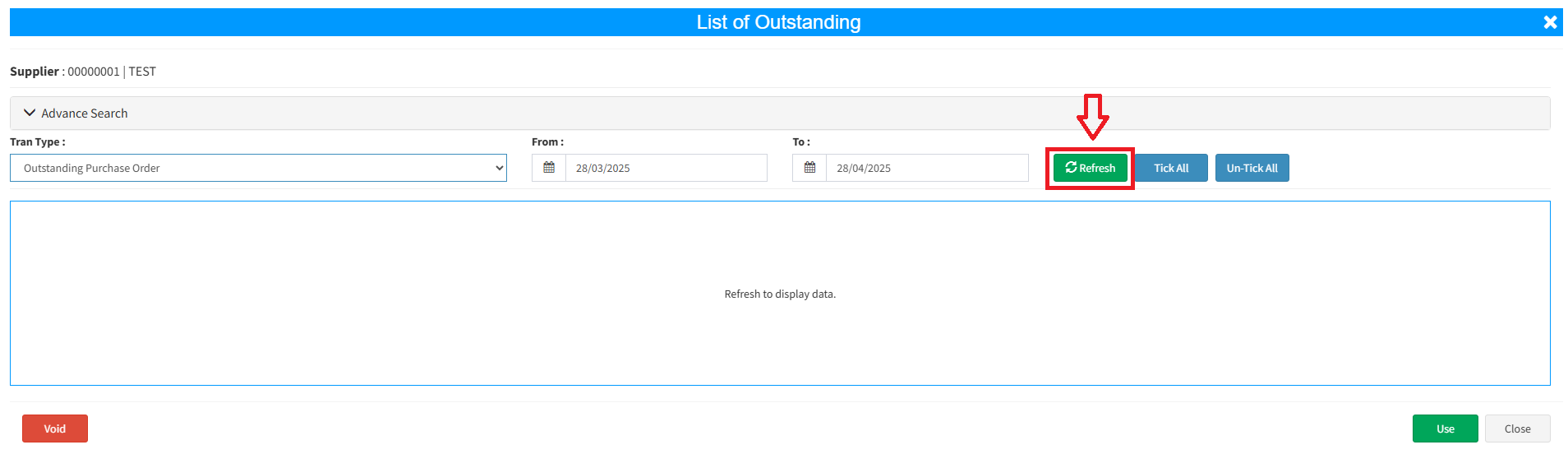4.You can pull up the outstanding purchase order by clicking the “Outstanding“ button.