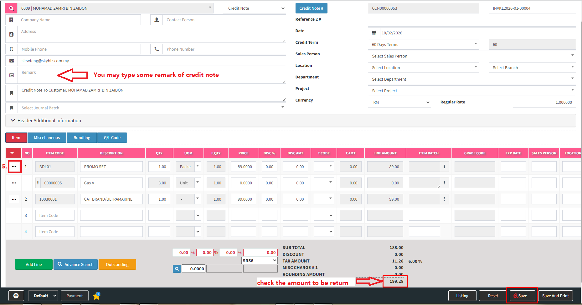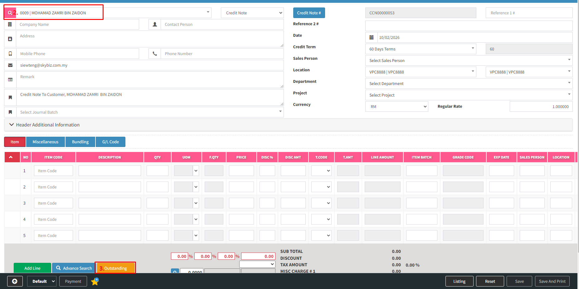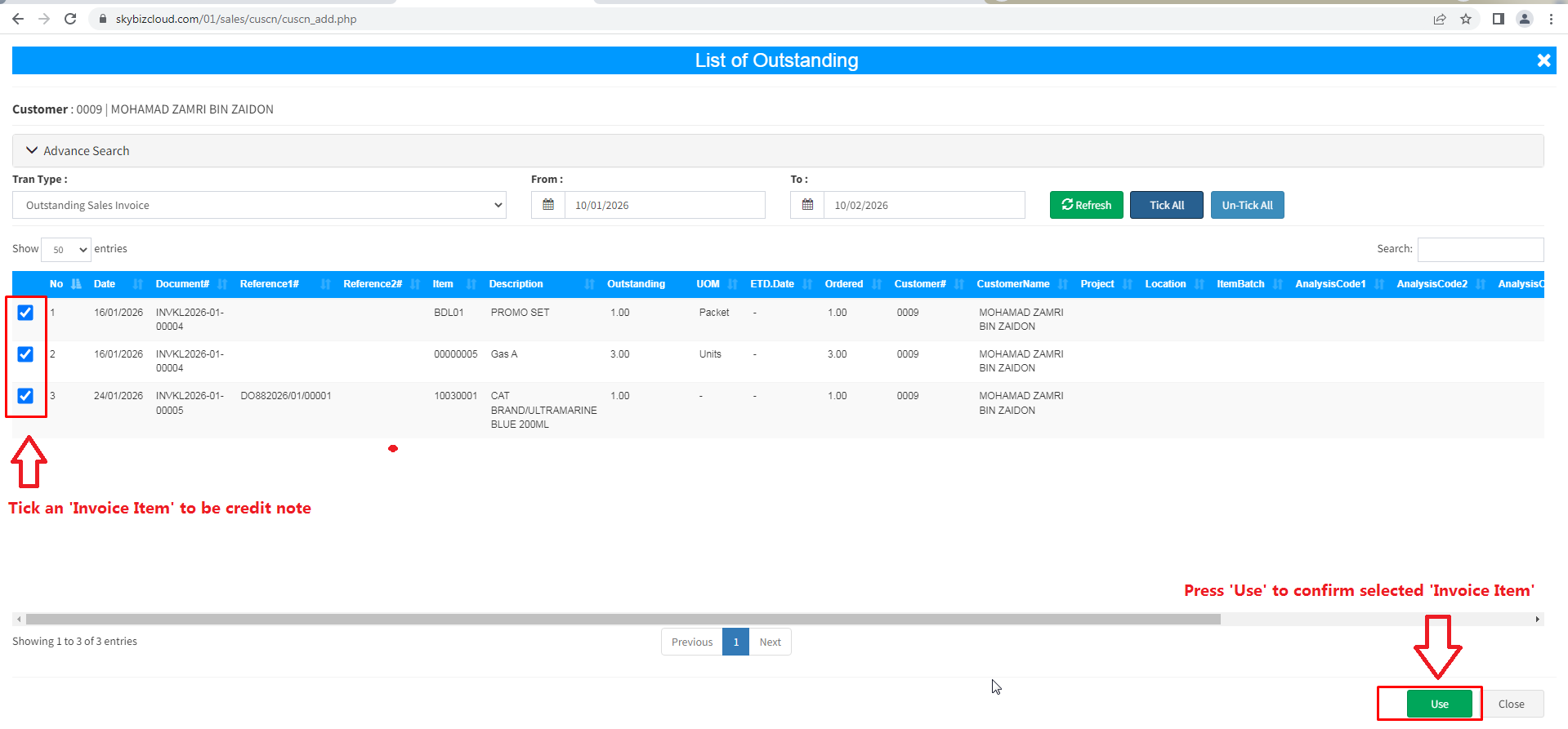 - Click button “outstanding ” and tick an “invoiced item” to be return.