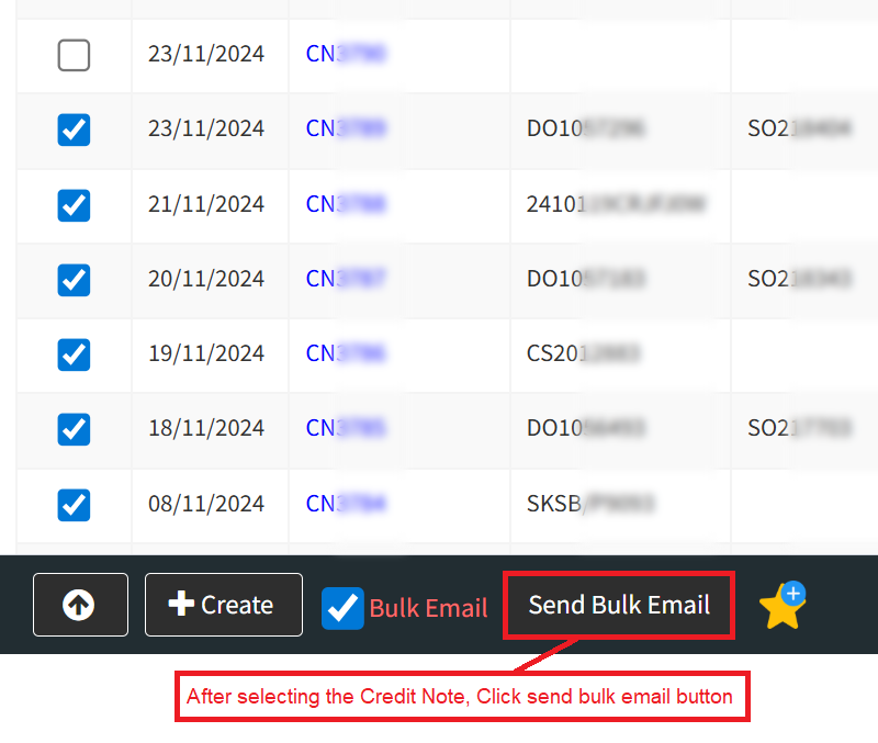 Step 4: Tick the Bulk Email checkbox, then select the specific Credit Note documents you want to send in bulk.