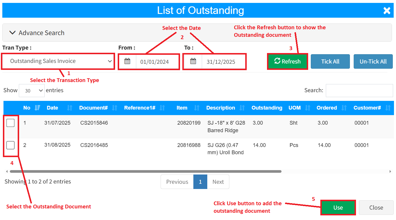 Step 4 (Optional): If you need to credit an existing record, please click the Outstanding button. From the List of Outstanding screen, filter for your specific Transaction Type and Date Period, then click Refresh. Simply select the record you wish to retrieve and click Use to proceed.