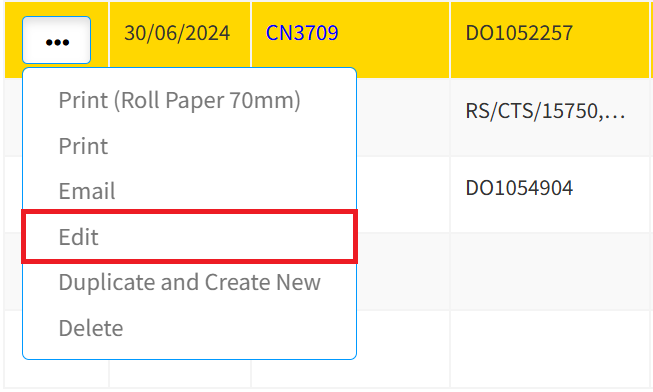 Step 3: Select the 3-Dots (Options) icon and click Edit to modify the details of the selected Credit Note to Customer.