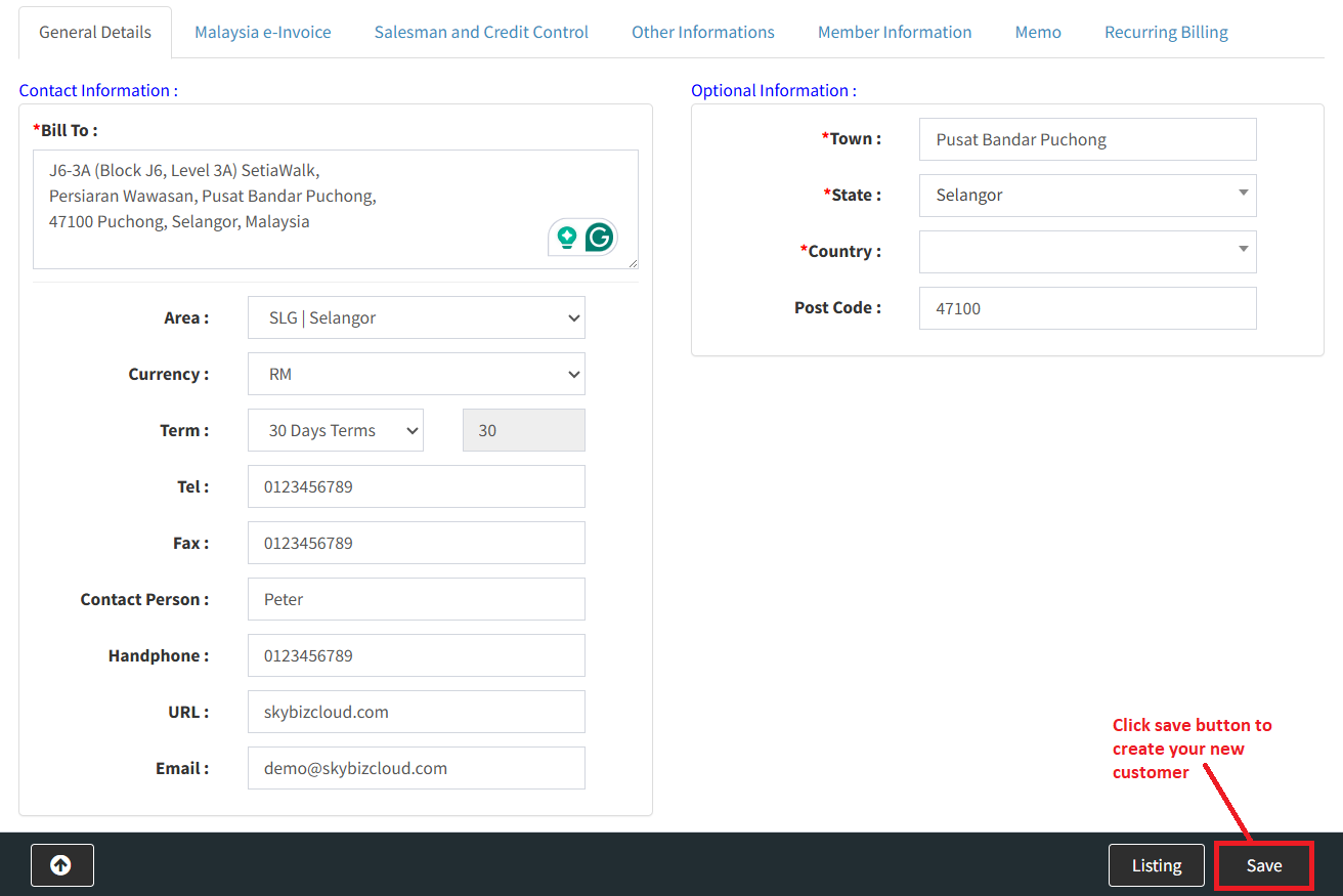 Step 3: Fill in all customer general details. You can also find and fill out the other information form by clicking the other tab. Click the save button to create your customer