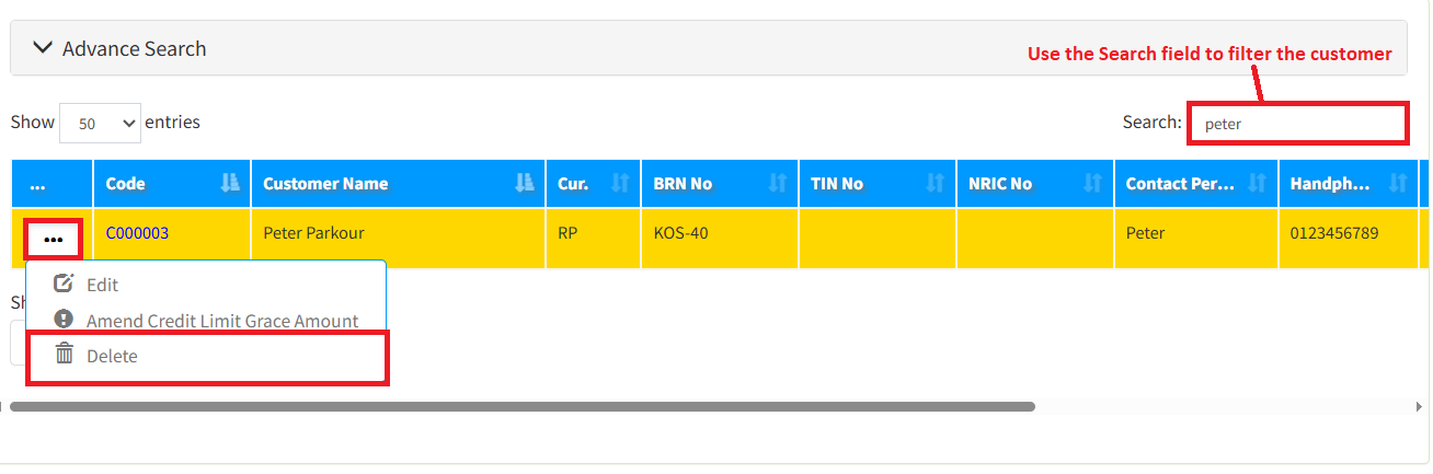 Step 3: Click the 3-Dots icon, then click Delete to remove your customer