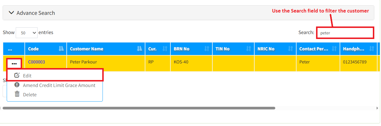 Step 3: Click the 3-Dots icon, then click Edit to modify your customer