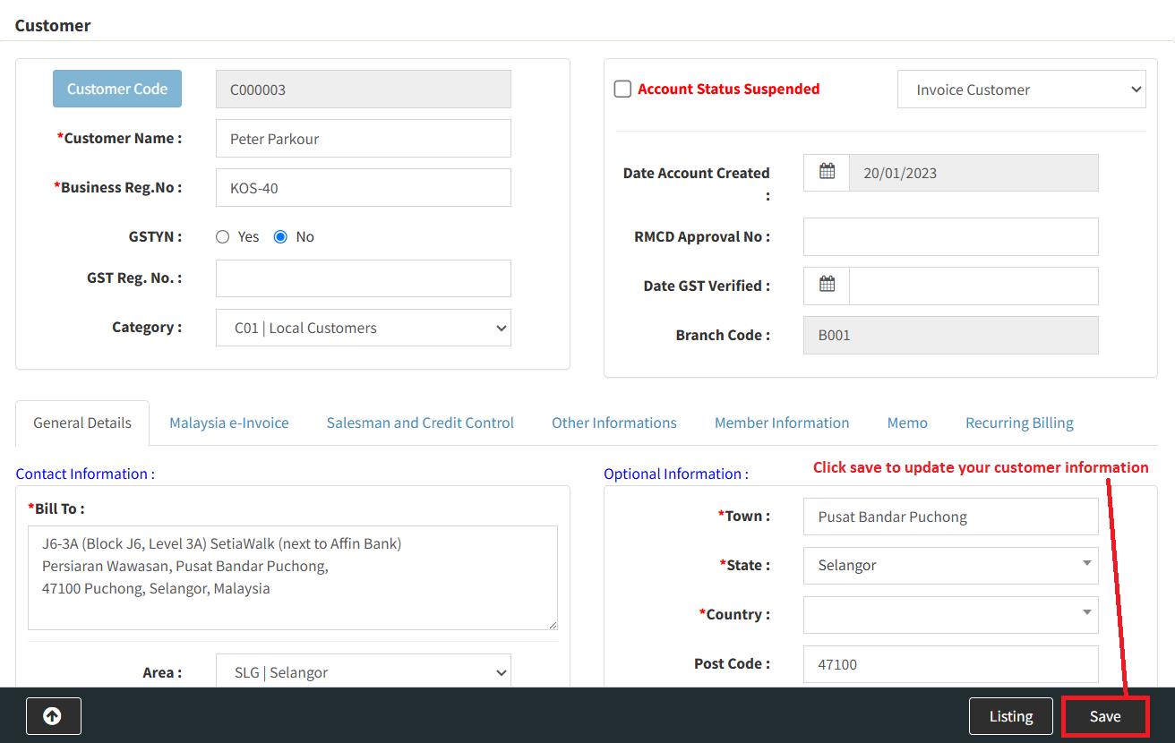Step 4: After modifying your customer, click the Save button to update your customer.