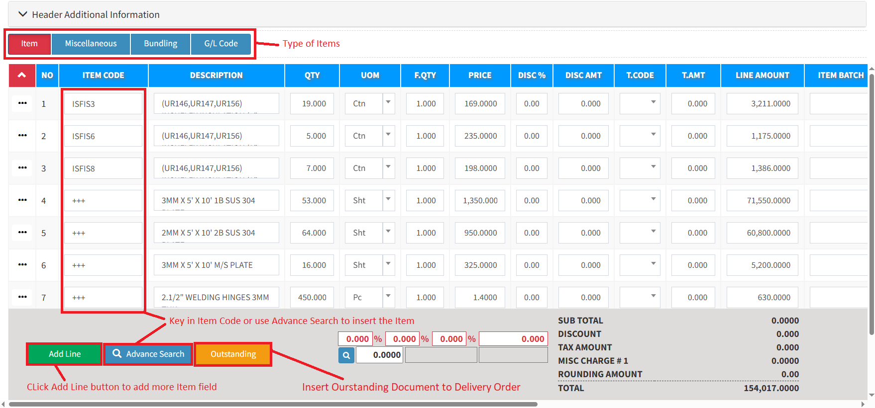Step 3: Select the item type, then add all kinds of inventory items/miscellaneous/GL that you want to add: