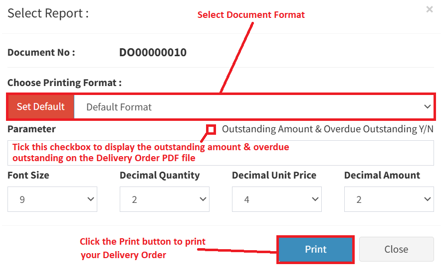 Step 4: Select the document format, then click the Print button to continue printing out your delivery order
