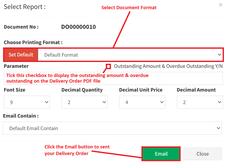 Step 4: Select the document format, then click the Email button to continue sending the Delivery Order to your customer