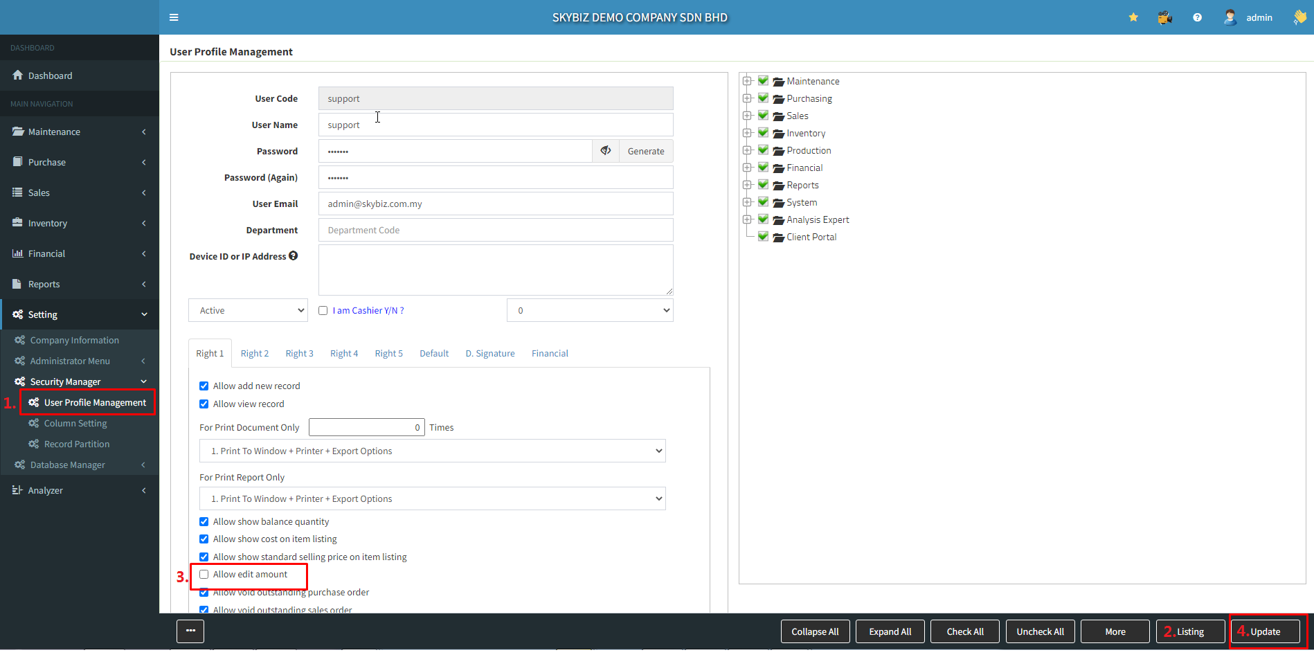 2025-10-07 08. Setting Below are guideline(s) to Disallow User to Edit Amount : Step 1 : Go to System >> Security Manager >> User Profile Management Step 2 : Select user ID from “List” Step 3 : Untick “Allow edit amount” Step 4 : Click “Update”