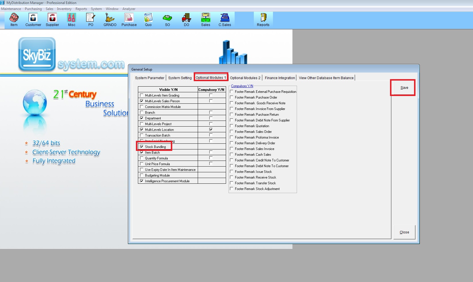 Step 1: Go to System  >> Administrator Menu >> General Setup >> Optional Module 1 >> Tick Stock Bundling then Save