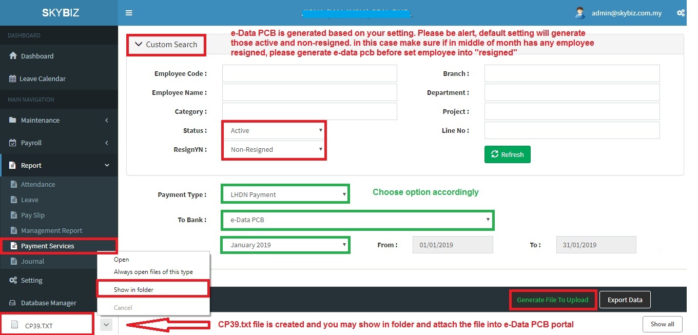 2. e-Data PCB is generated based on your setting. Please be alert, default setting will generate those active and non-resigned employee(s). in this case make sure if in middle of month has employee resigned, please generate e-data pcb before set employee into “resigned”.
