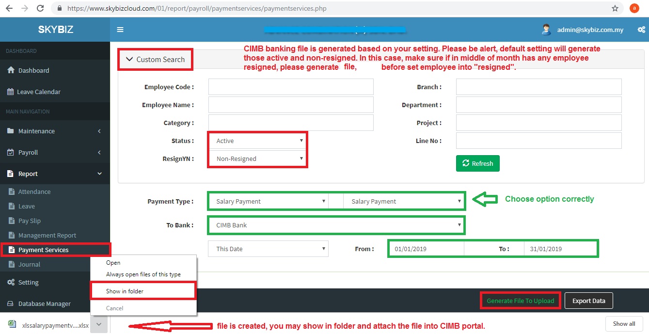 5. CIMB file is generated based on your setting. Please be alert, default setting will generate those active and non-resigned employee(s). in this case make sure if in middle of month has employee resigned, please generate file before set employee into “resigned”.