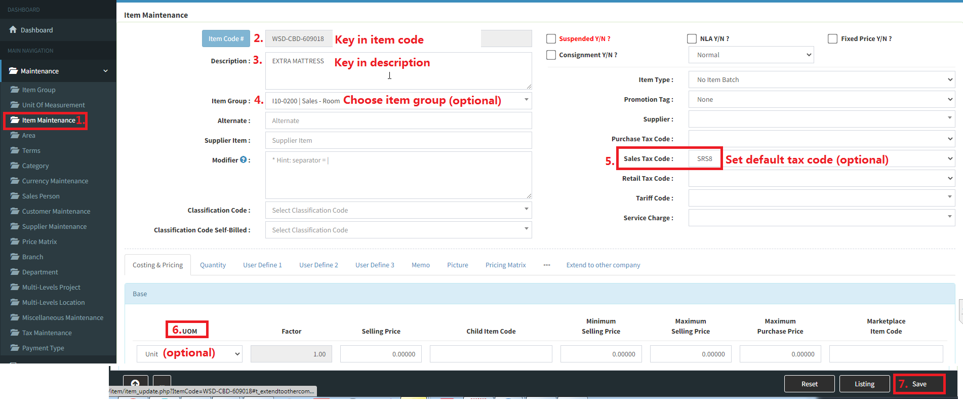Step 01: Please go item maintenance to add [example : EXTRA MATTRESS]