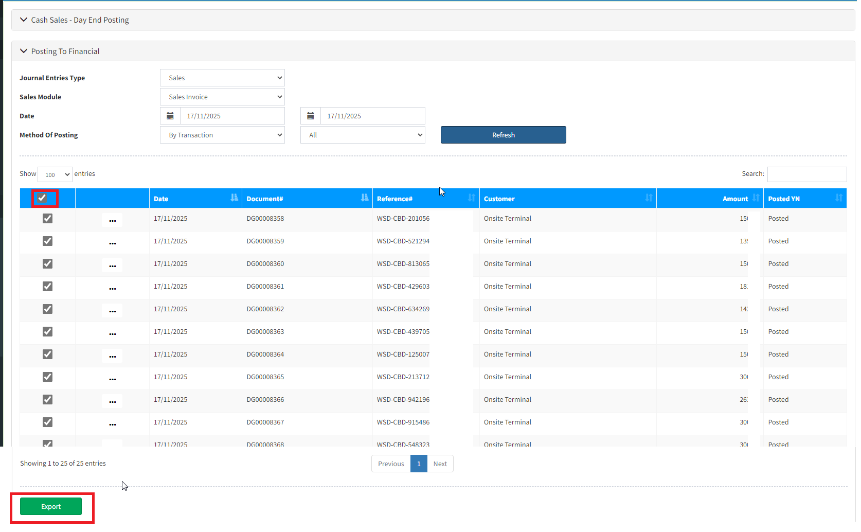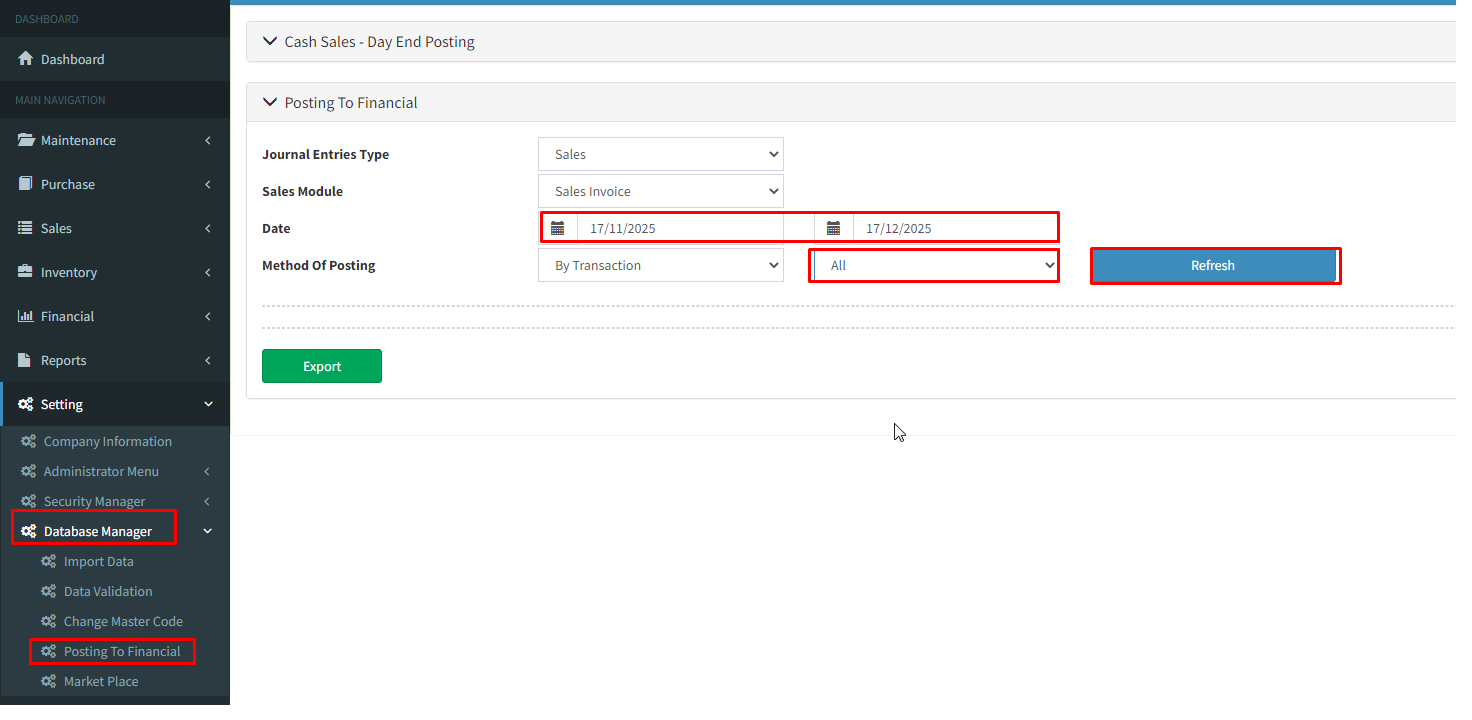 8a: At menu go to setting>>> Database manager>>> Posting to financial