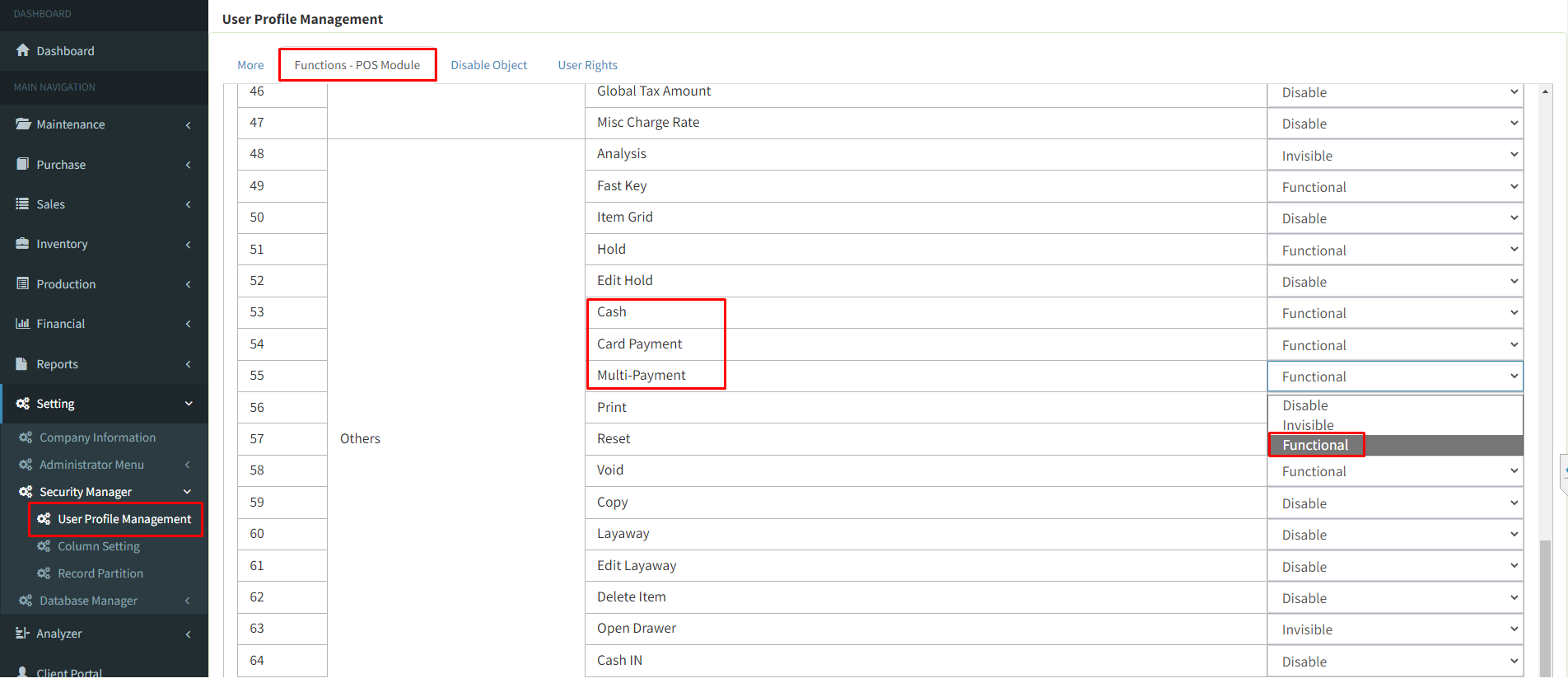2025-06-24 08. Setting Options in system setting: (refer below photo) Please go setting >>> User Profile Management >>> [choose user] >>> more >>> Functions-Pos Module {Functional} -Please choose this option if you wish to allow card payment and multi payment.