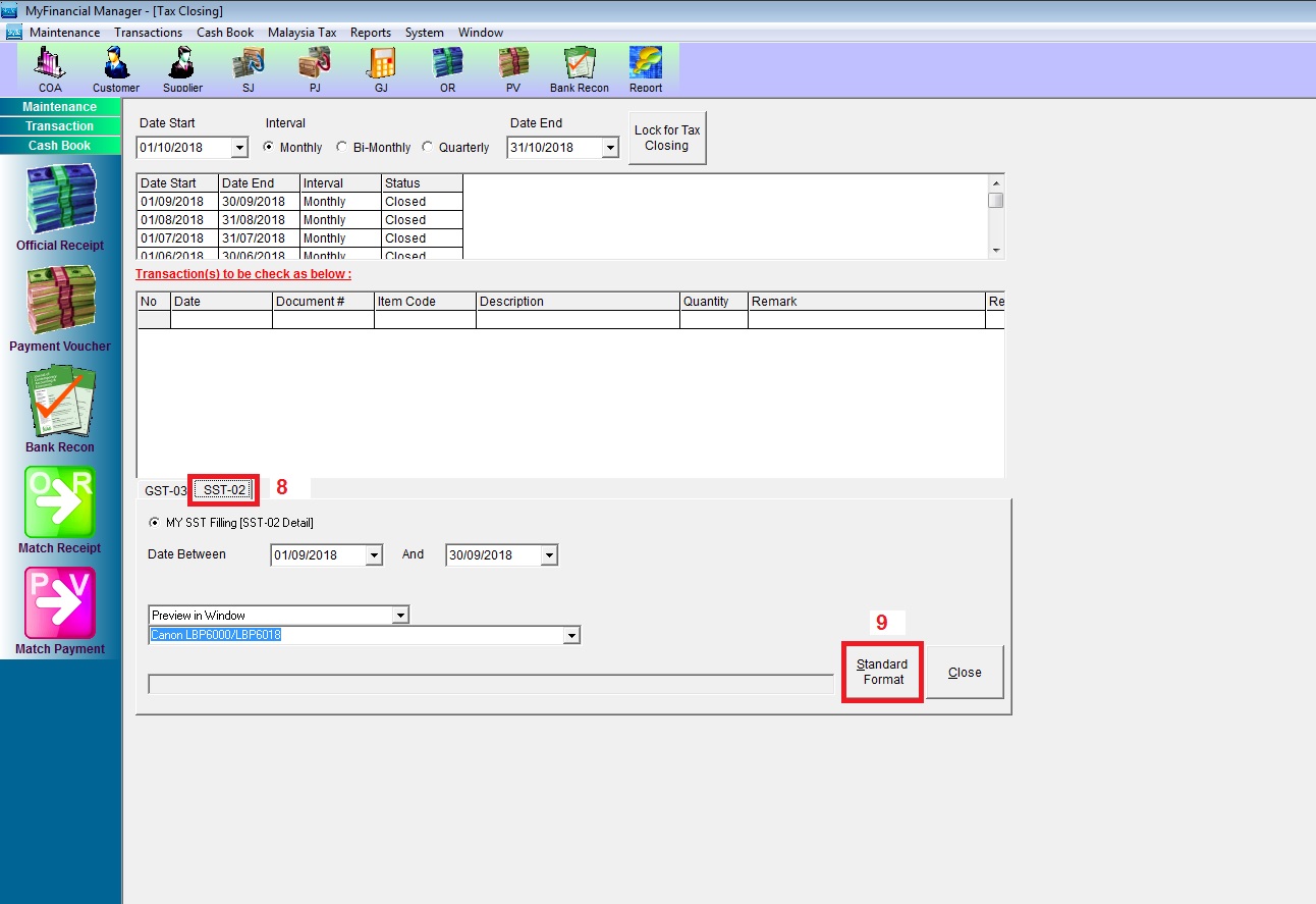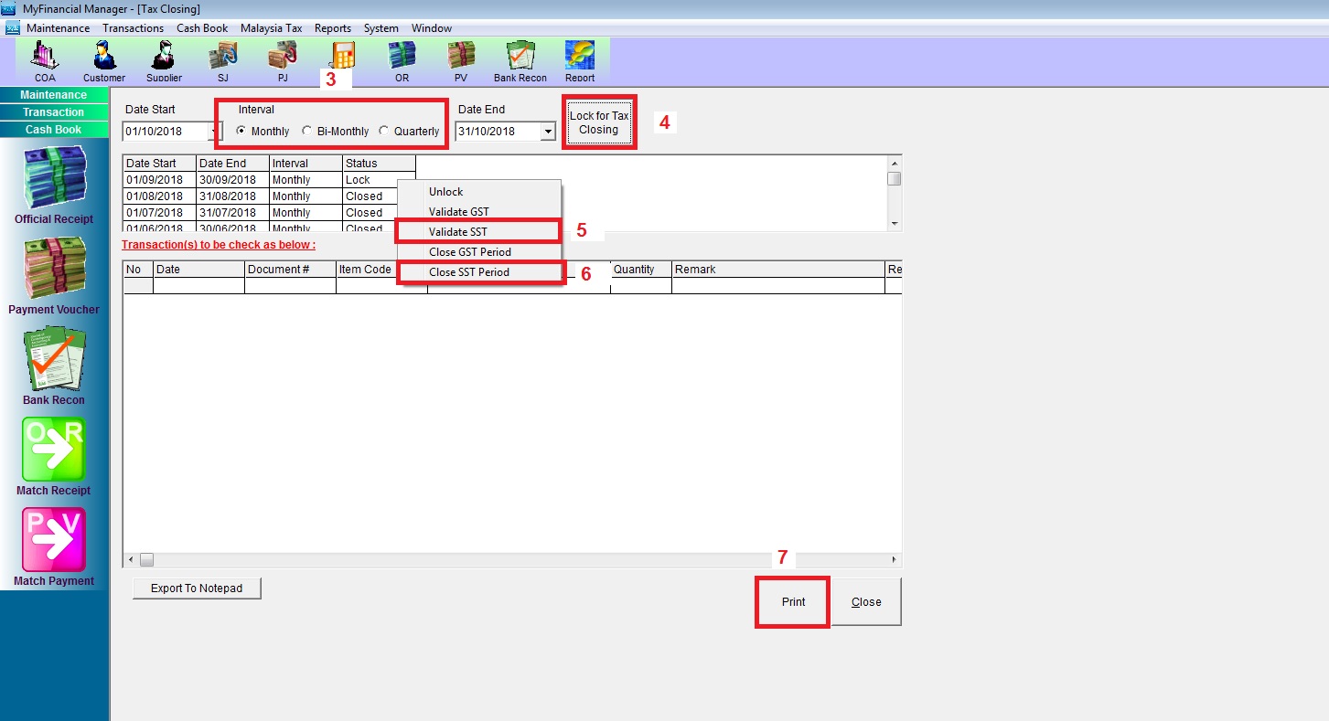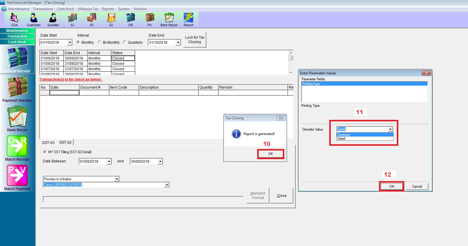 **N/B: You can Lock period first and check the report if all transaction posted on SST-02 is correct,after confirm all data are accurate then you can Right click the period to Closed SST.