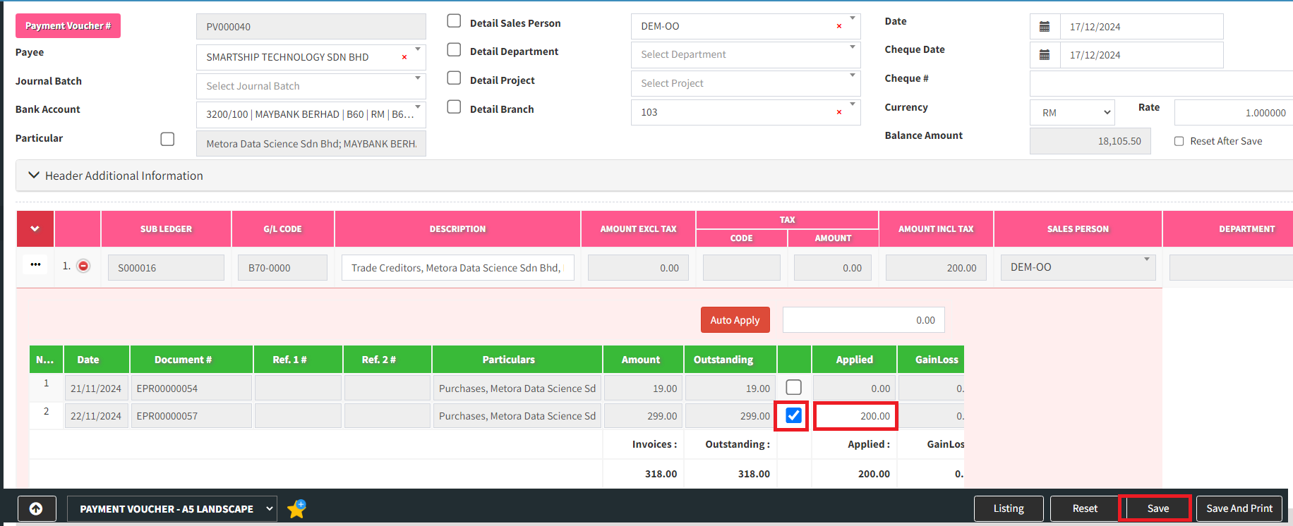 For this example, i will make partical payment of 200. Click “Save” to record this payment. voucher