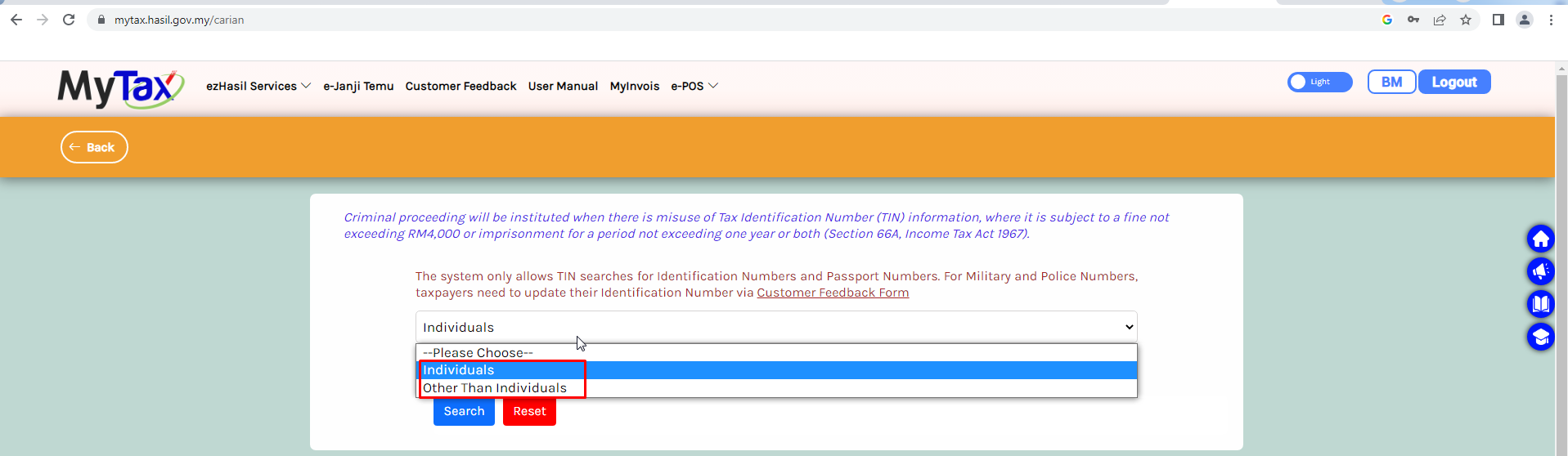 For individuals, you can search using their IC number (MyKad) or passport number.