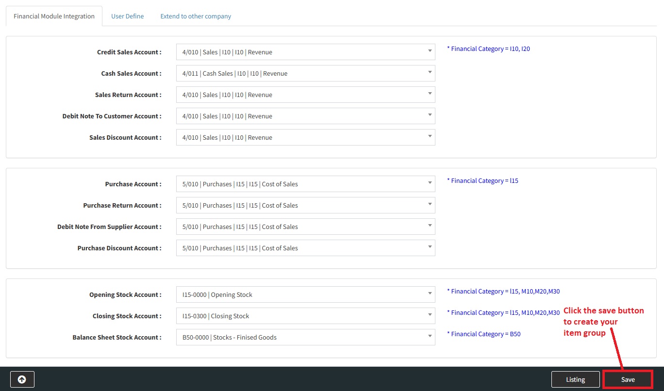 Step 4: Fill in all Financial Module Integration fields, then click the save button to create your Item Group