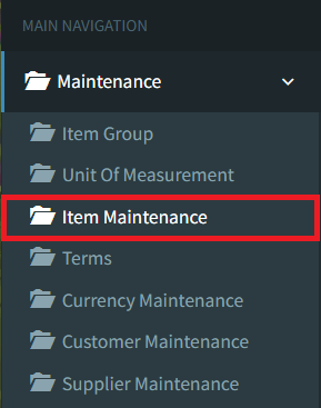 Step 1: To create an item on Item Maintenance, navigate to Maintenance > Item Maintenance