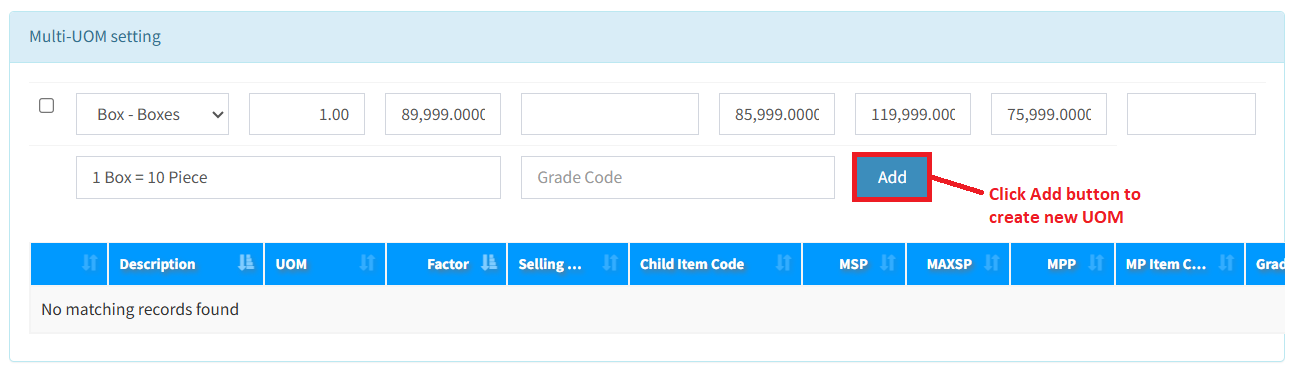 Step 4 (optional): If you want to sell the item with another UOM, you can also fill in all fields then click the Add button to create a new UOM