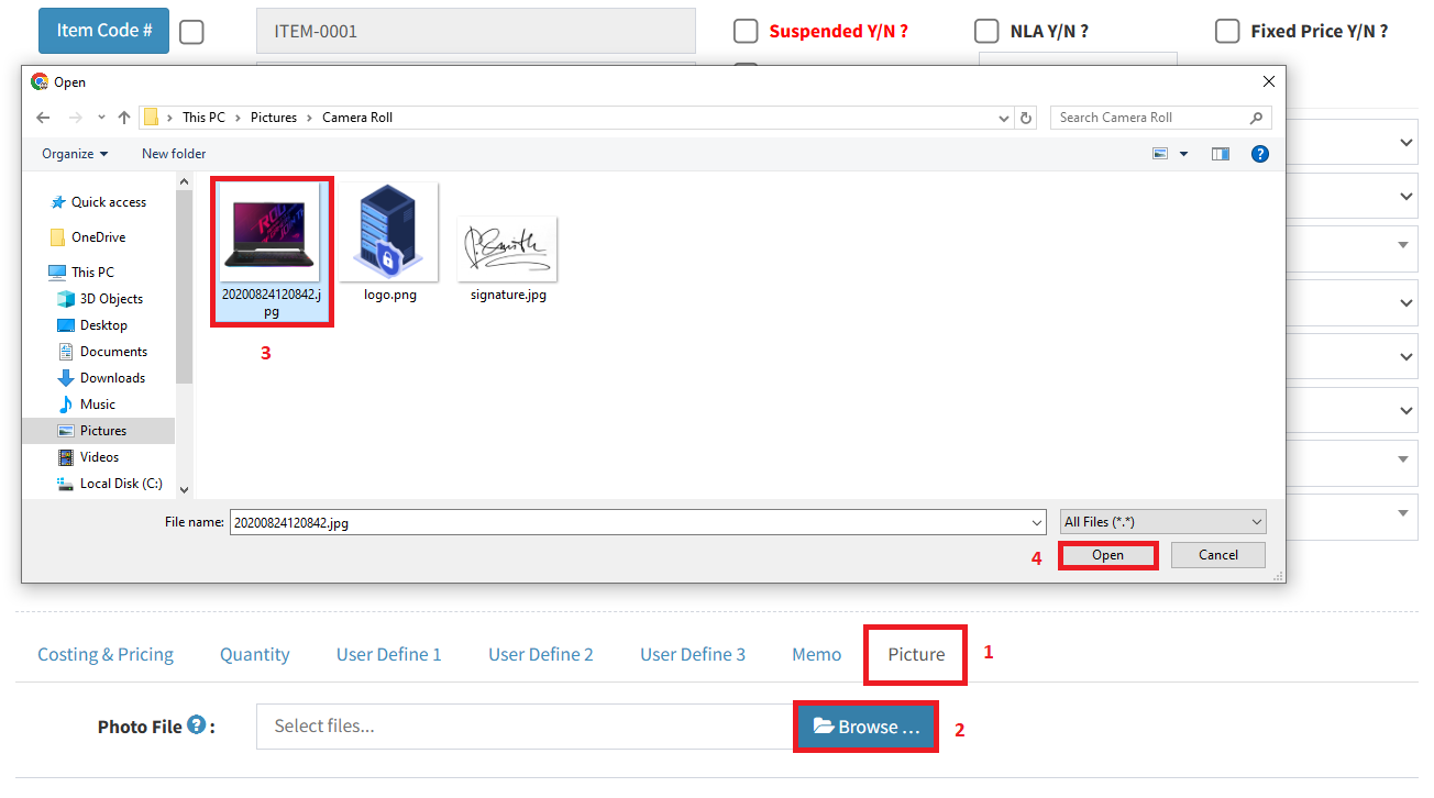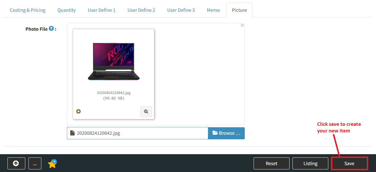 Step 5: To upload the item image, you can click the Picture tab then click the Browse… button to upload your item image