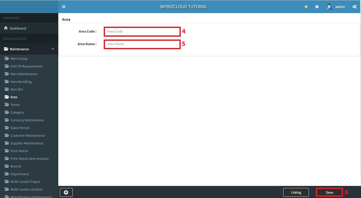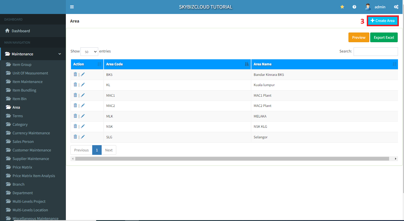 - Tap the main menu ≡ button in the top left corner>>Maintenance>>Area.