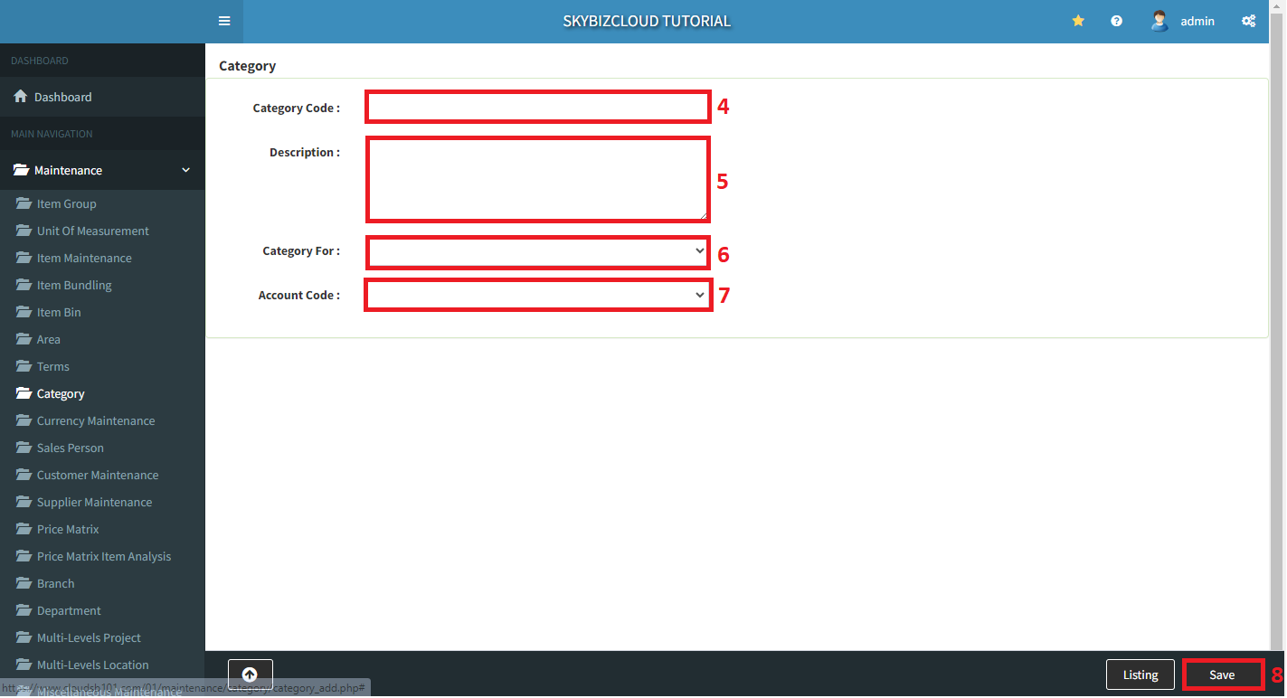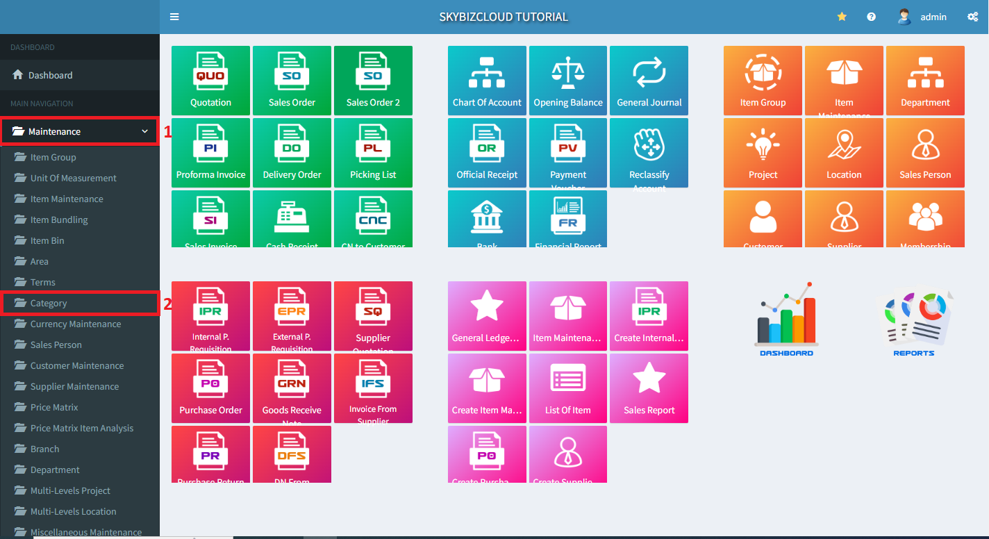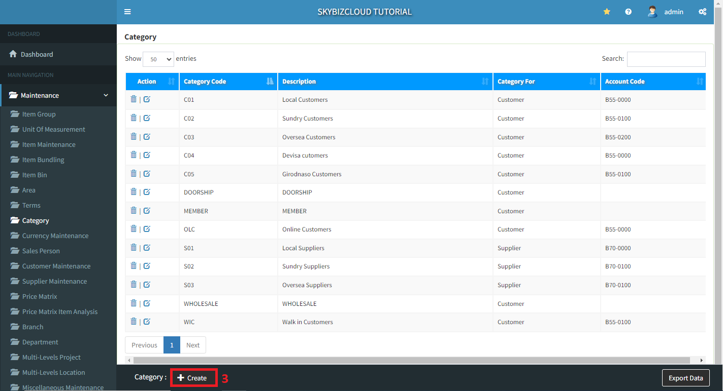2024-03-29 01. Maintenance, 0107.Category Below are guideline(s) to create new Category: Tap the main menu ≡ button in the top left corner>>Maintenance>>Category. Create Category Tap Create. Create Category Key in your category details>>Save Key in Category details Powered By : SKYBIZ ® Beyond Cloud ™