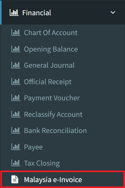 Step 1: To consolidate e-Invoice, navigate to Financial > Malaysia e-Invoice