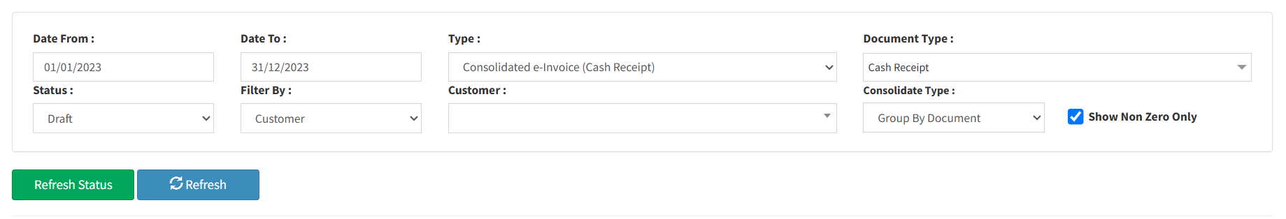 Step 2: Select Consolidate e-Invoice as the Type, and you can filter the document by date, document type, or status. After that, click the Refresh button.