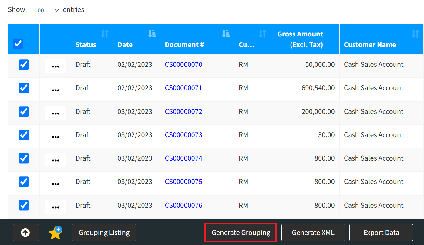 Step 3: Select the document you want to submit to Malaysia e-Invoice, then click the Generate Grouping button to group your document before submitting.