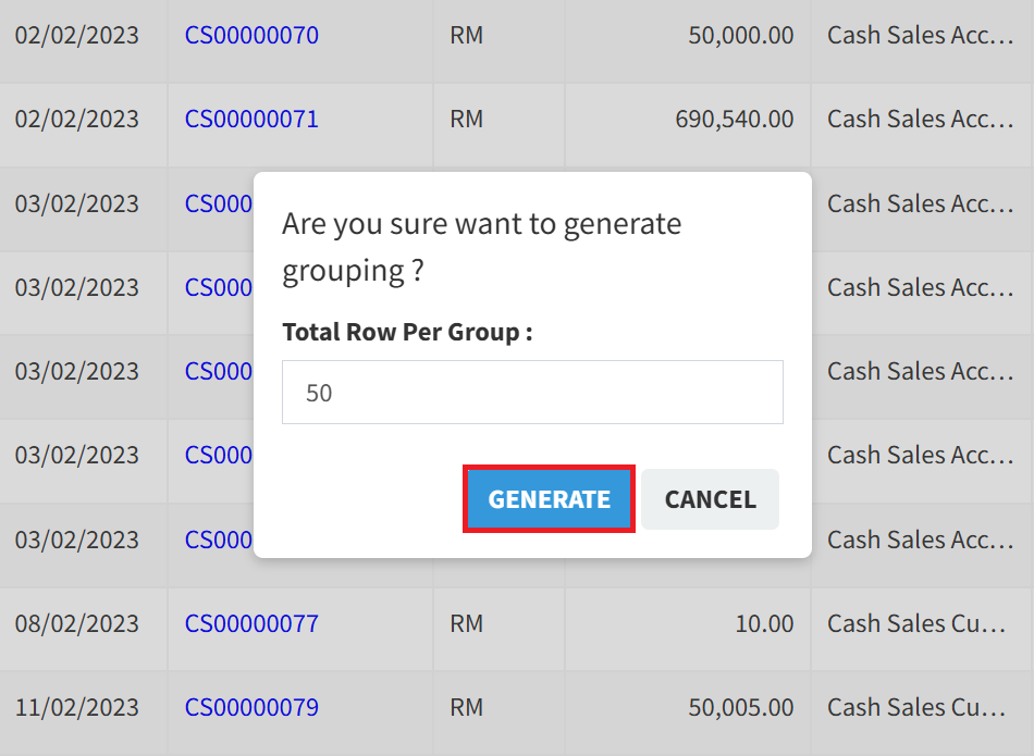 Step 4: Enter the total number of transactions per 1 consolidated e-Invoice (50 is recommended), then click the Generate button.