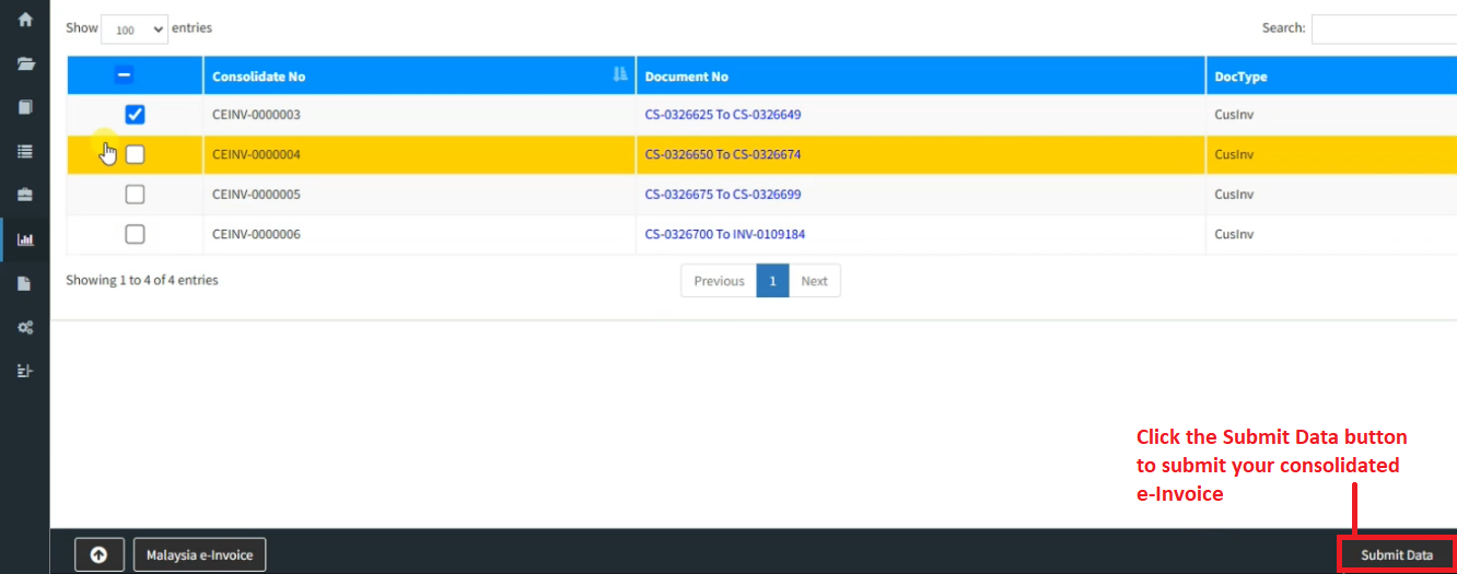 Step 6: Select the Consolidated e-Invoices, then click the Submit Data button.