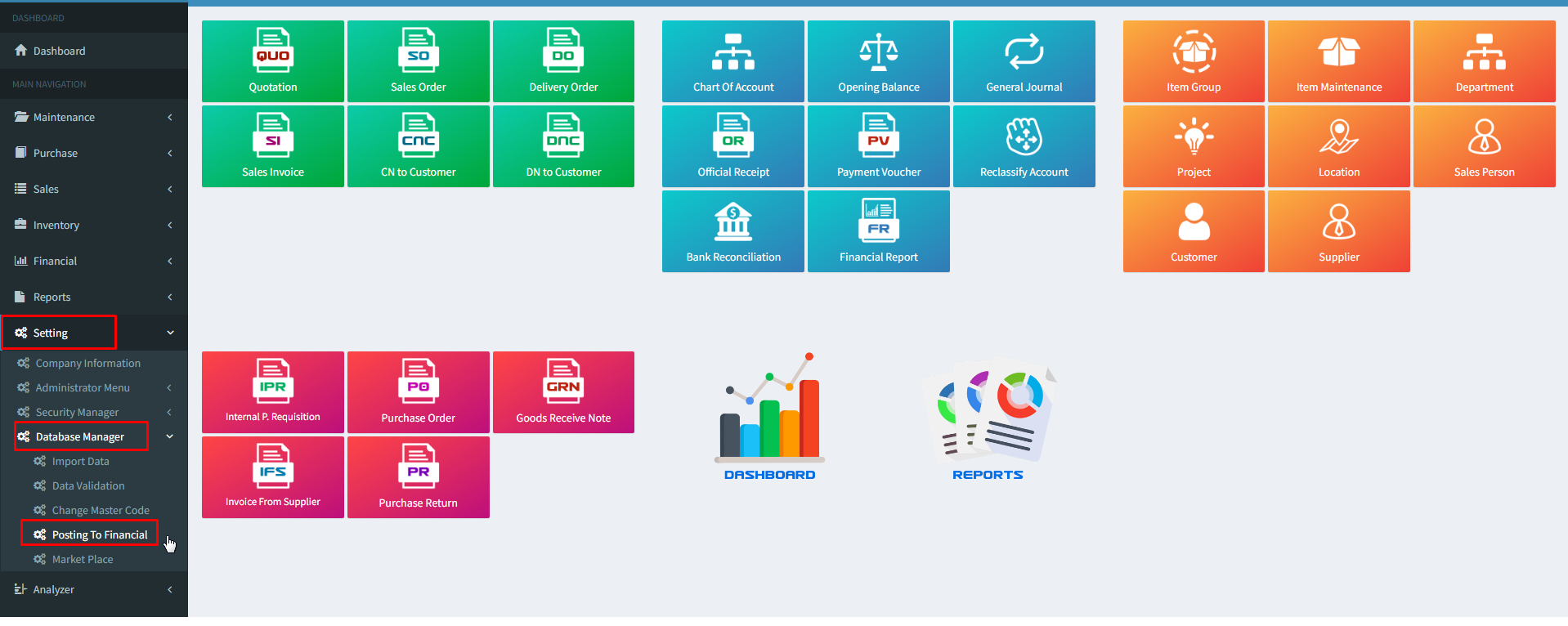 Step 1: Go to Setting >> Database Manager >> Manual Posting to Financial