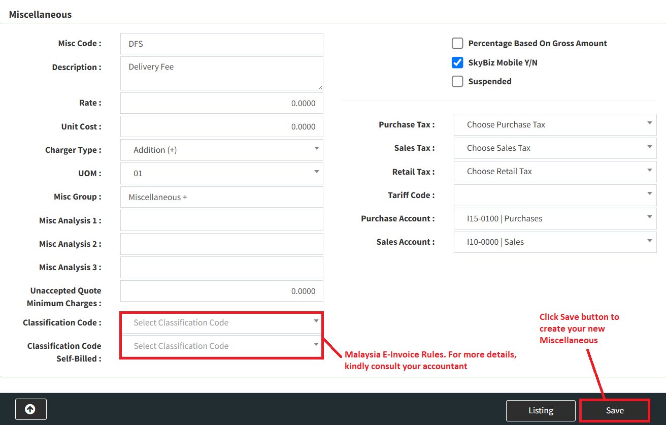 Step 3: Fill in all fields with your miscellaneous details, then click the Save button to create your new miscellaneous